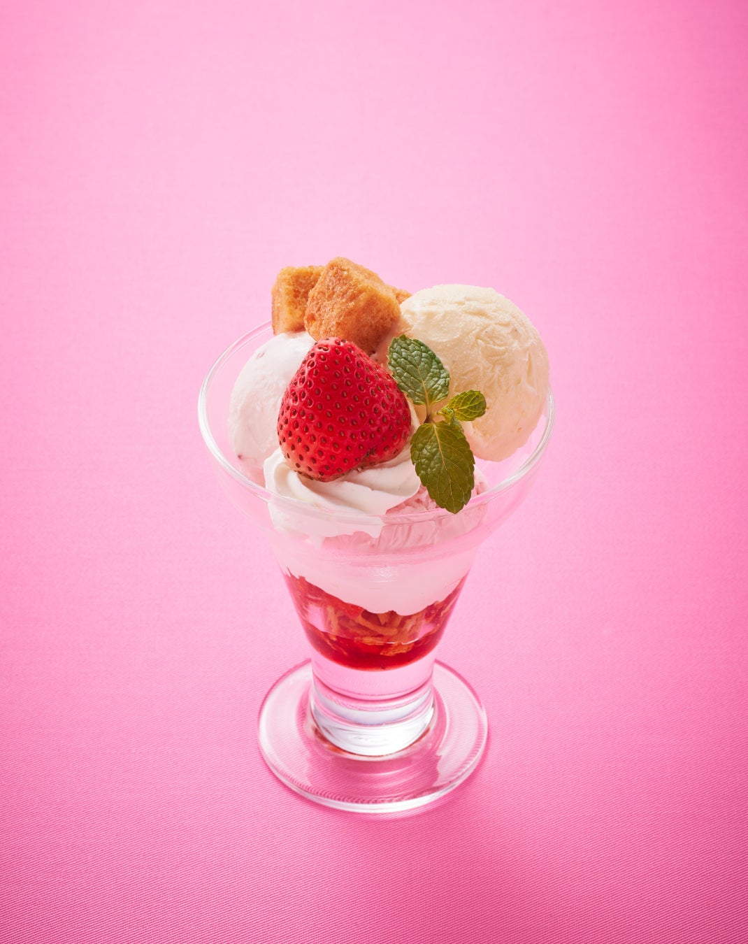 心躍る苺の季節の到来です。ラウンジで一息つくティータイムに、食べやすいサイズの苺スイーツをご用意します。フレッシュ苺やバター香るラスク、バニラ・あまおう苺・ストロベリーマスカルポーネの3種のアイスを食べ進めると、カットした苺やコーンフレーク、苺ソースが現れ、苺の甘酸っぱさとそれぞれに異なる食感が楽しい一品です。