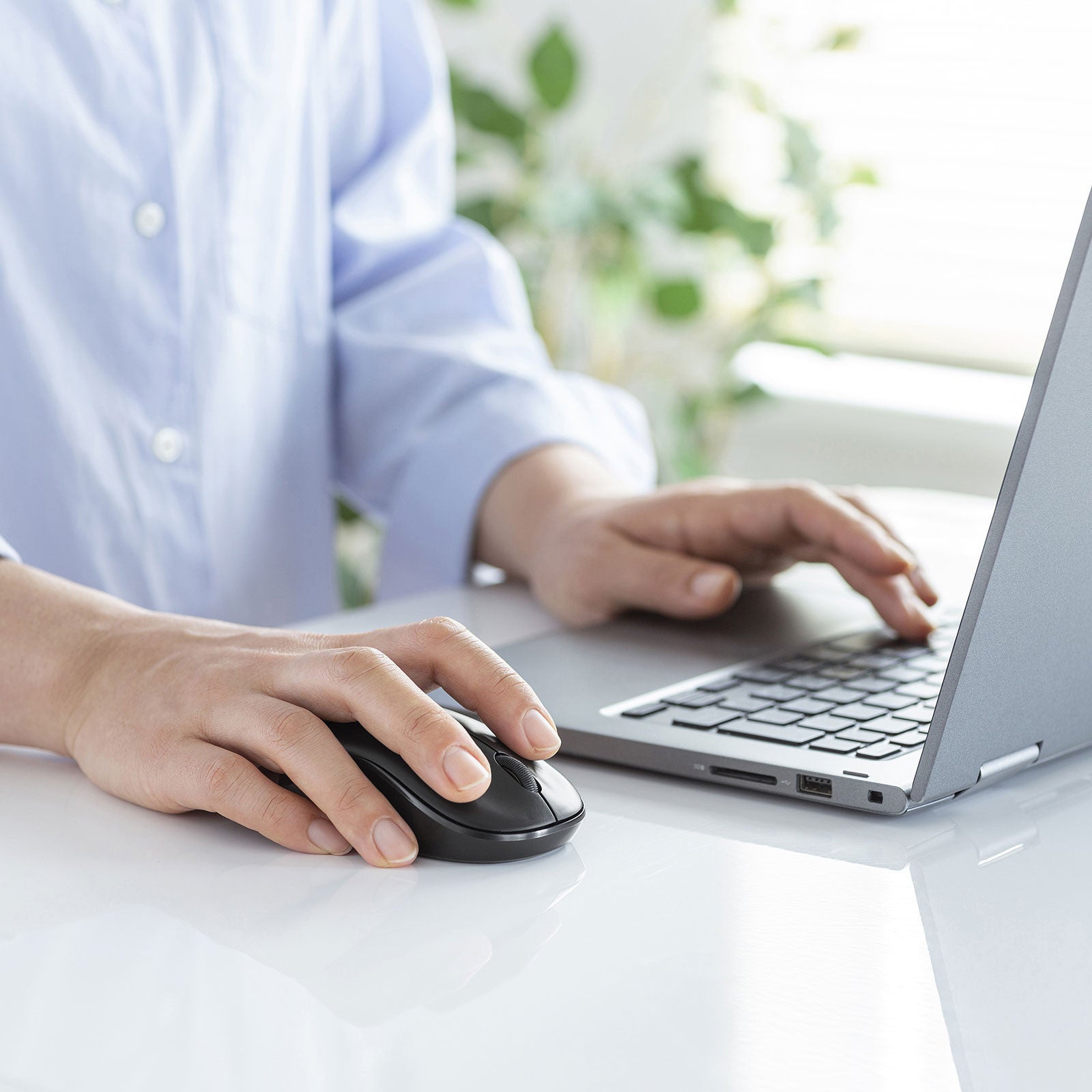 レシーバーはマウスに収納することができます。極小レシーバーなのでポート装着時の出っぱりが小さく、 ノートパソコンにレシーバーを装着したままの持ち運びや保管にも邪魔になりません。