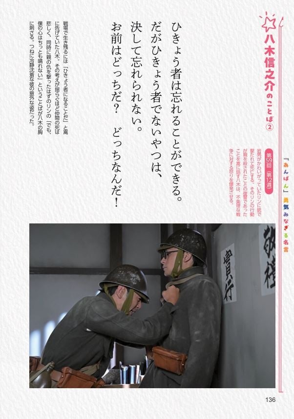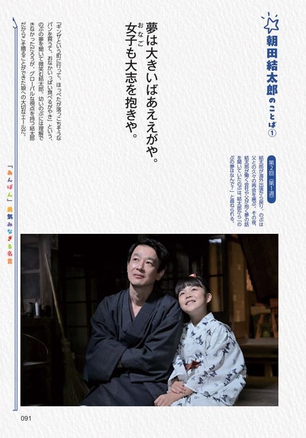 本書で紹介するのは、のぶのたくましさが現れている、パン食い競走での「女子でもおもいっきり夢を追いかけてえいがやって」という前向きなセリフや、加瀬亮演じるのぶの父・結太郎が、“ギンザ”に憧れる幼いのぶに贈る「夢は大きいばあええがや。女子(おなご)も大志を抱きや」というエールなど、視聴者の胸を熱くさせた言葉や涙なくしては読めない言葉など、いずれも珠玉の名言ばかり。ぜひ何度も読み返してください。