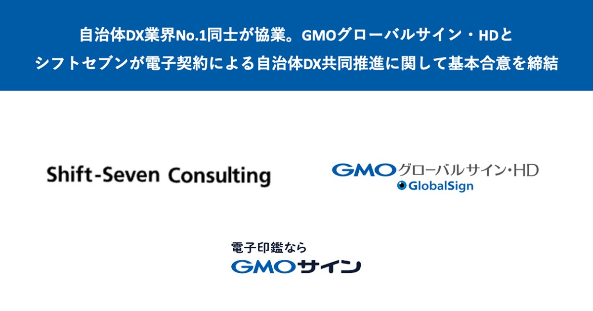 GMOグローバルサイン・ホールディングス株式会社(代表取締役社長:青山満 以下、GMOグローバルサイン・HD)と株式会社シフトセブンコンサルティング(代表取締役:井本憲史 以下、シフトセブン)は、電子契約サービス「電子印鑑GMOサイン」の提供を通じて自治体における契約DXの共同推進を図るべく、業務提携の検討を開始する基本合意を締結しましたので、お知らせいたします。