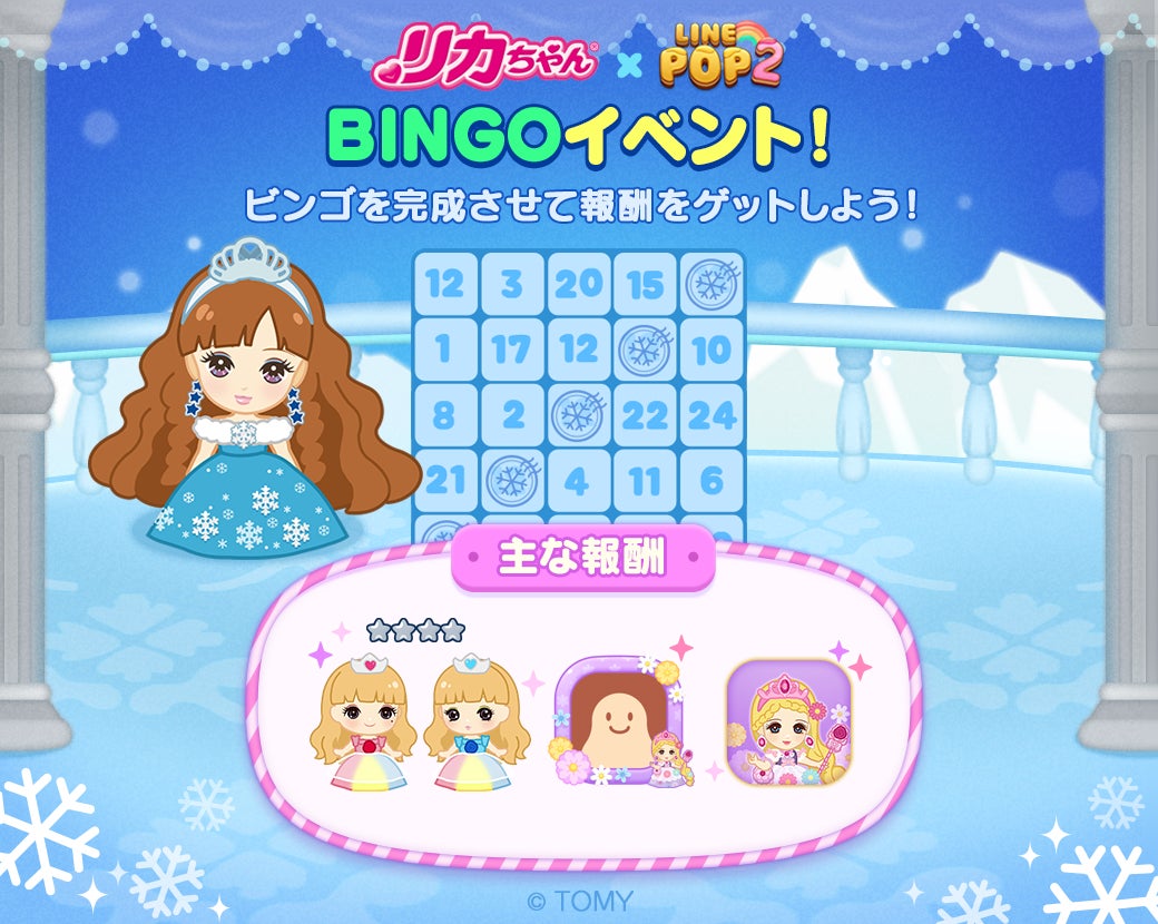 通常ステージをクリアしてビンゴをすべてそろえると、「★4 ミキちゃん&マキちゃん」やコラボ限定フレームとプロフィールがもらえる『リカちゃん』のビンゴイベントを開催します。