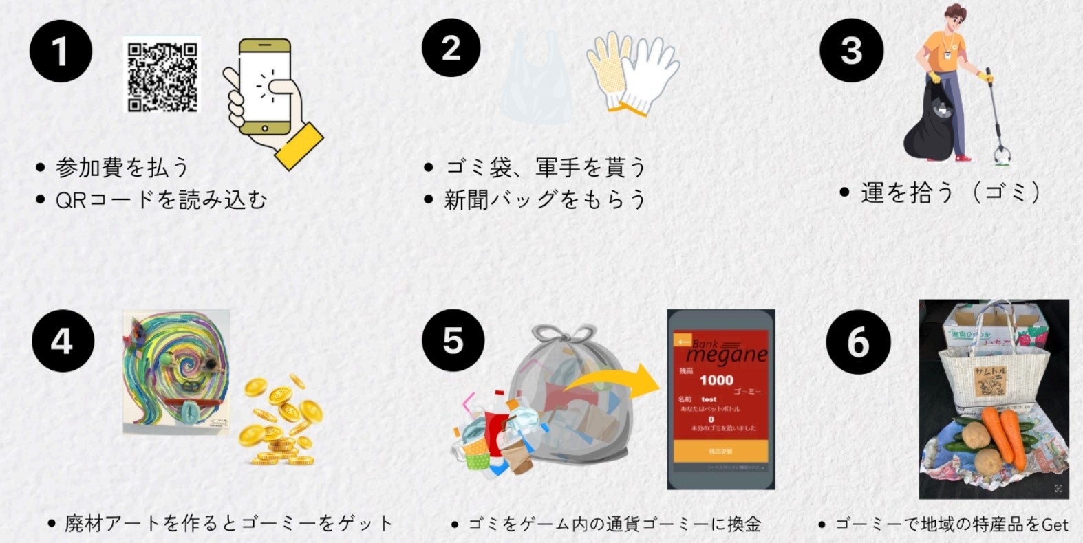 「SAMURAI TRUSH」(以下、サムトル)は、定められたエリアで時間内にごみを拾うイベントです。拾ったごみの量を計り、専用アプリで利用できる通貨「ゴーミー」に換金し、地域の特産品と交換したり、廃材アート製作などのワークショップへの参加の際にポイントとして利用することができます。イベントを通じてごみ拾いが価値(通貨)に変わり、交換アイテムを地域の特産品にすることで、地元に還元される仕組みとなっています。