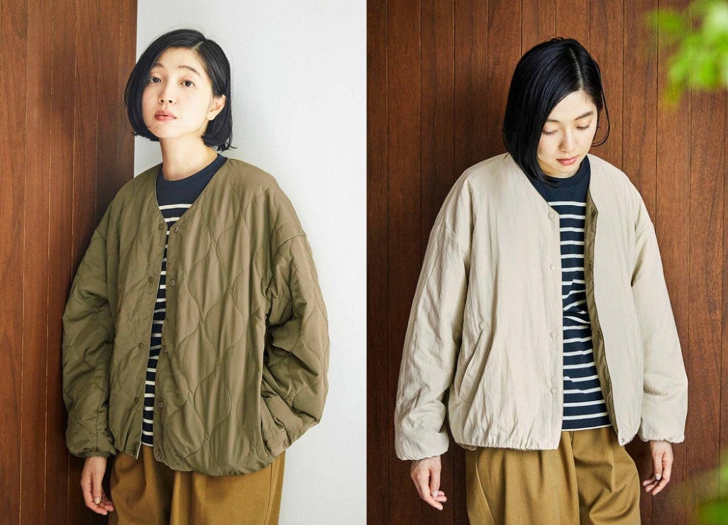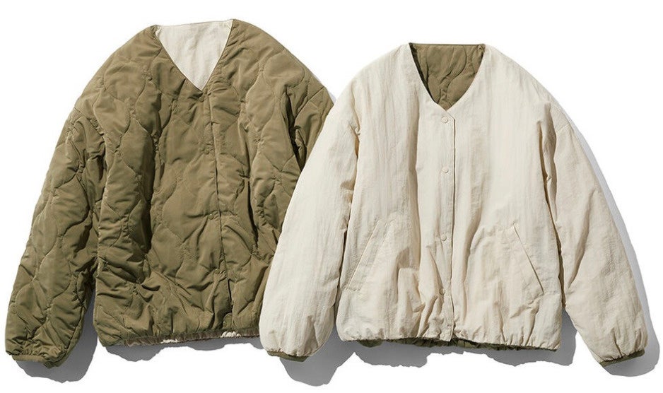 ひょうたんキルトのカーキとフラットなアイボリーの、リバーシブルで使えるジャケットです。装いや気分に合わせて着まわせるように、両面とも印象の異なるベーシックカラーが使われています。控えめな存在感が大人っぽい、ベースと同色にしたドットボタインもポイントです。カーディガンをはおる感覚で、秋口から春先まで長く着られるように、ほどよいボリュームの中綿でふんわりと仕上がっており、タートルネックやフーディなどさまざまなインナーとの相性を考えて、首もとは浅めのVネックになっています。また、どんなボトムスと合わせてもバランスよく着こなせるように、すそにゴムが入っています。