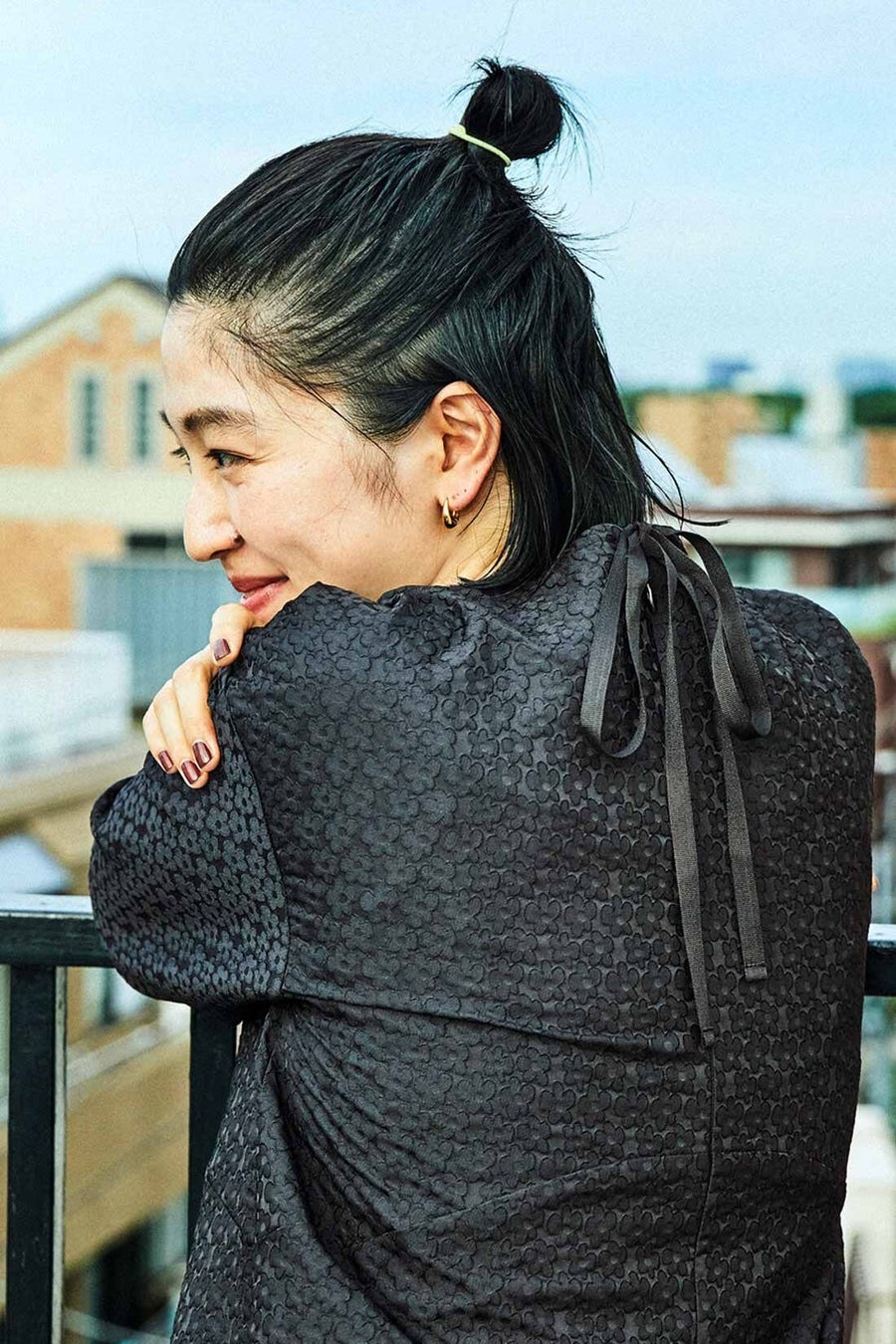 おみゆさんの友人たちからの「シンプルな黒のワンピースが欲しい」という声を受け、改めて定番服に向き合うことからスタートした企画。特徴的な表面感のジャカード素材で、カジュアルにもきれいめにも着られる、すっきりとしたシルエットに仕上がっています。織りで表現した甘すぎない花柄や、ゆるくカーブをきかせた胸下の切り替えなど、女性らしさを随所にきかせて、後ろのリボンでやさしい揺れ感を添えています。