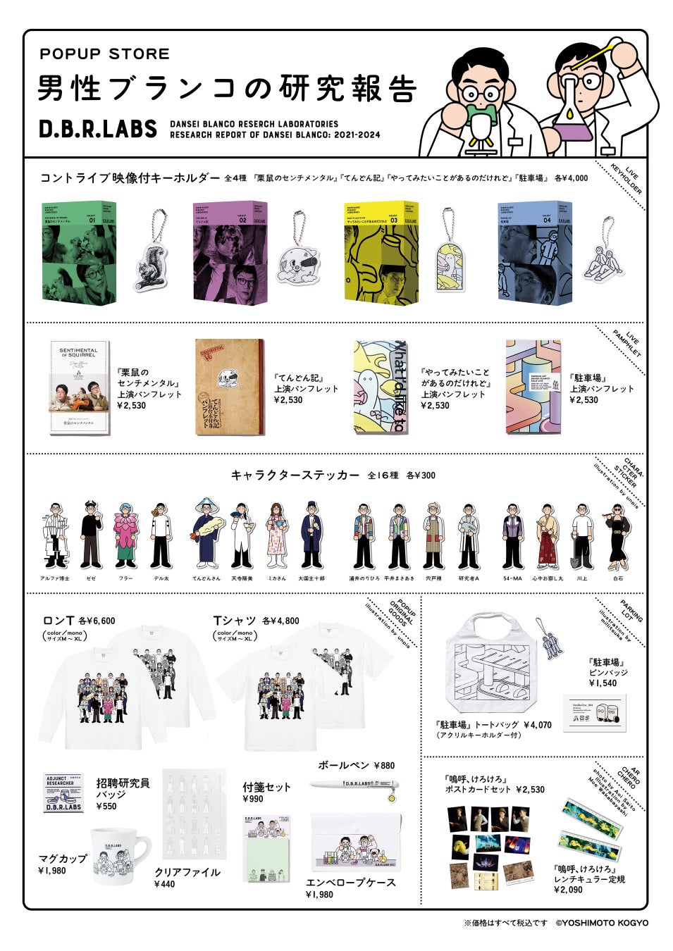 ポップアップストアでは、「男性ブランコを秘密裏に研究する架空の機関『D.B.R.LABS』による研究報告」というテーマで、過去公演のライブ映像が視聴できるQRコード付きキーホルダー、公演パンフレット、ステーショナリー、雑貨などを展開します。過去公演『栗鼠のセンチメンタル』、『てんどん記』、『やってみたいことがあるのだけれど』、『駐車場』に登場した個性あふれるキャラクターのステッカー16種類など、男性ブランコのこれまでを凝縮したアイテムをご用意しております。アートディレクションは川名潤、メインビジュアル・イラストはイラストレーターunpisの描きおろしです。また、過去公演で使用した小道具や衣装の展示も実施します。