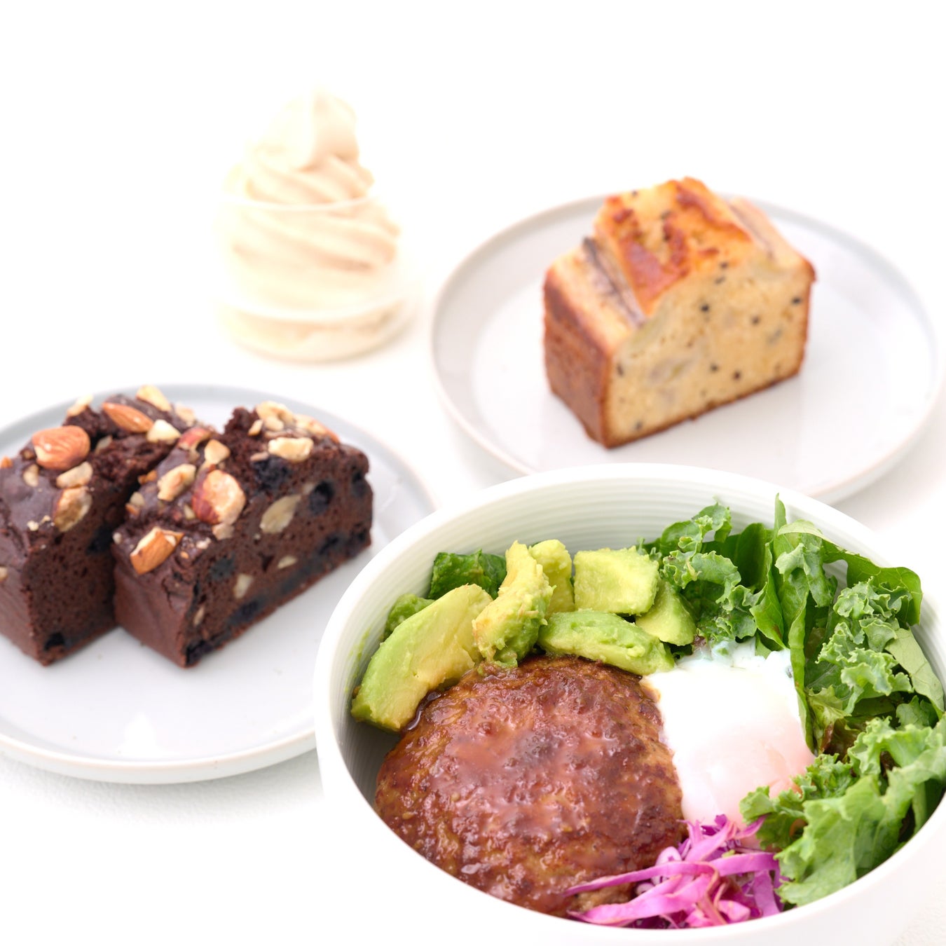 自然に近い形で育ったナチュラルビーフを使用。Cosme Kitchen Adaptationで大好評のオリジナルレシピのハンバーグがごろっとのった、こだわりいっぱいのロコモコ丼は、温玉とアボガドとともに食欲そそるてりやき風ソースで仕上げました。