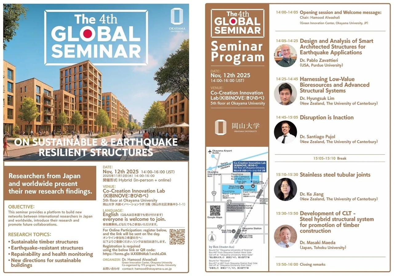 国立大学法人岡山大学(本部:岡山市北区、学長:那須保友)の岡山大学グリーンイノベーションセンター(GIC)は、2025年11月12日、岡山大学共創イノベーションラボ(KIBINOVE)5階において、「第4回 持続可能・耐震構造に関するグローバルセミナー」 がハイブリッド形式(対面+オンライン)で開催されました。