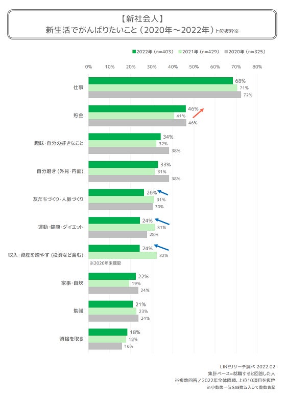 「貯金」は昨年から約6ポイントの上昇がみられました。その一方で世界情勢の悪化や社会の状況などが影響しているのか、「収入・資産を増やす(投資など含む)」は昨年から8ポイント減少しています。他、「運動・健康・ダイエット」「友だちづくり・人脈づくり」も昨年から減少しています。
