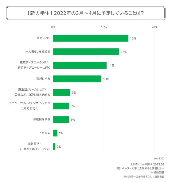 今回、「旅行に行く」「東京ディズニーランド/東京ディズニーシーに行く」という入学前の思い出作りになるような項目が上位にみられました。割合としては高くありませんでしたが、これには調査時点(2022年2月末)で、まん延防止等重点措置の適用期間の地域も多かったことが影響している可能性があります。また、新生活に向けて「一人暮らしを始める」「引っ越しする」という人も1割台いることがわかりました。
