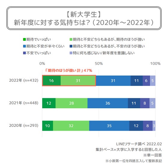 【LINEリサーチ】新生活は「期待の方が強い」と回答した新大学生と新社会人の割合が昨年よりも上昇傾向 がんばりたいことでは、新大学生、新社会人ともに「友だちづくり・人脈づくり」が2020年から減少傾向