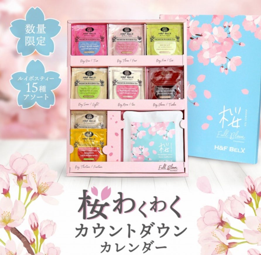桜の開花を待ちわびながら楽しめる春のアドベントカレンダー。14種のフレーバーを毎日わくわくしながらティータイムを楽しんでいくと、15日目には桜フレーバー5包入りが待っています!
