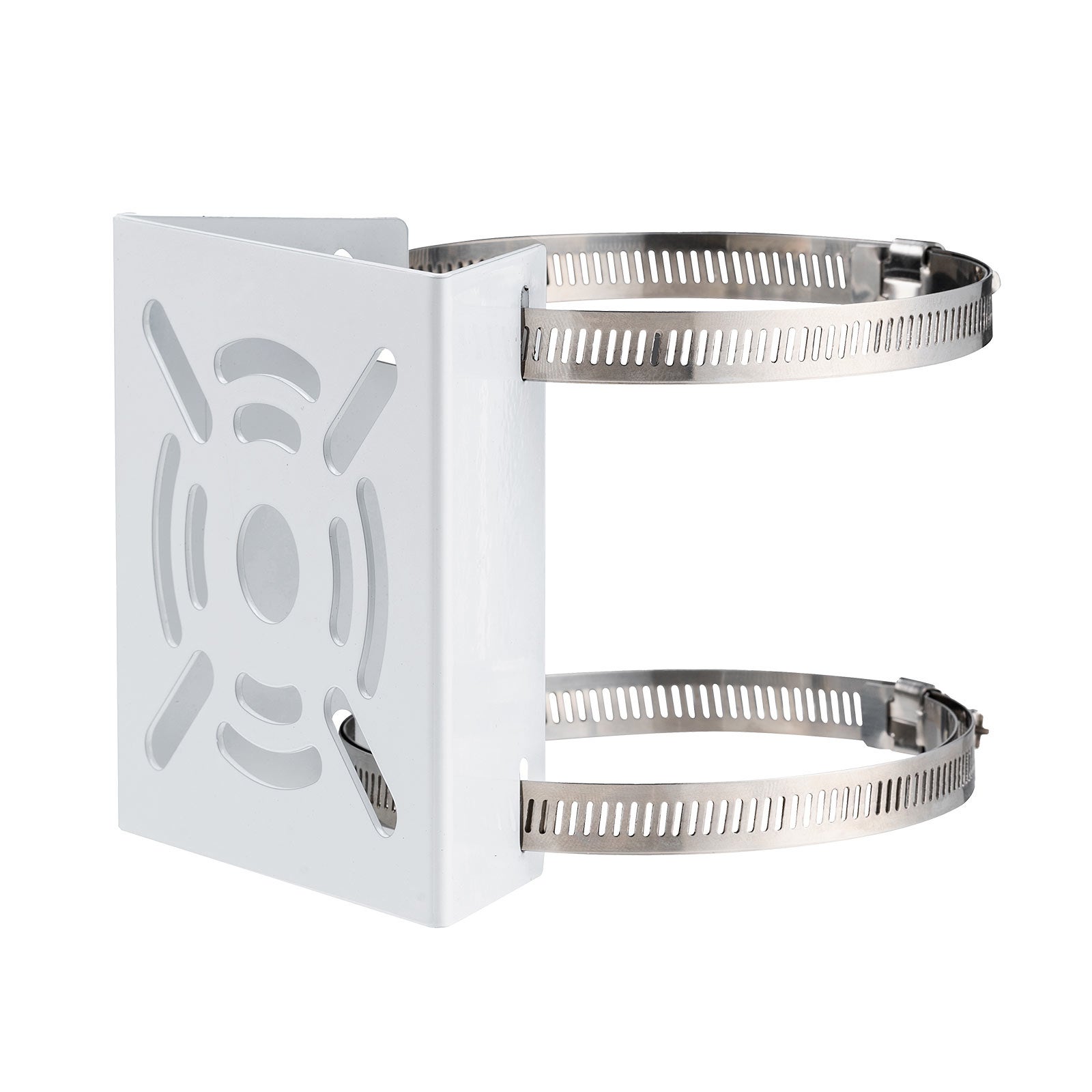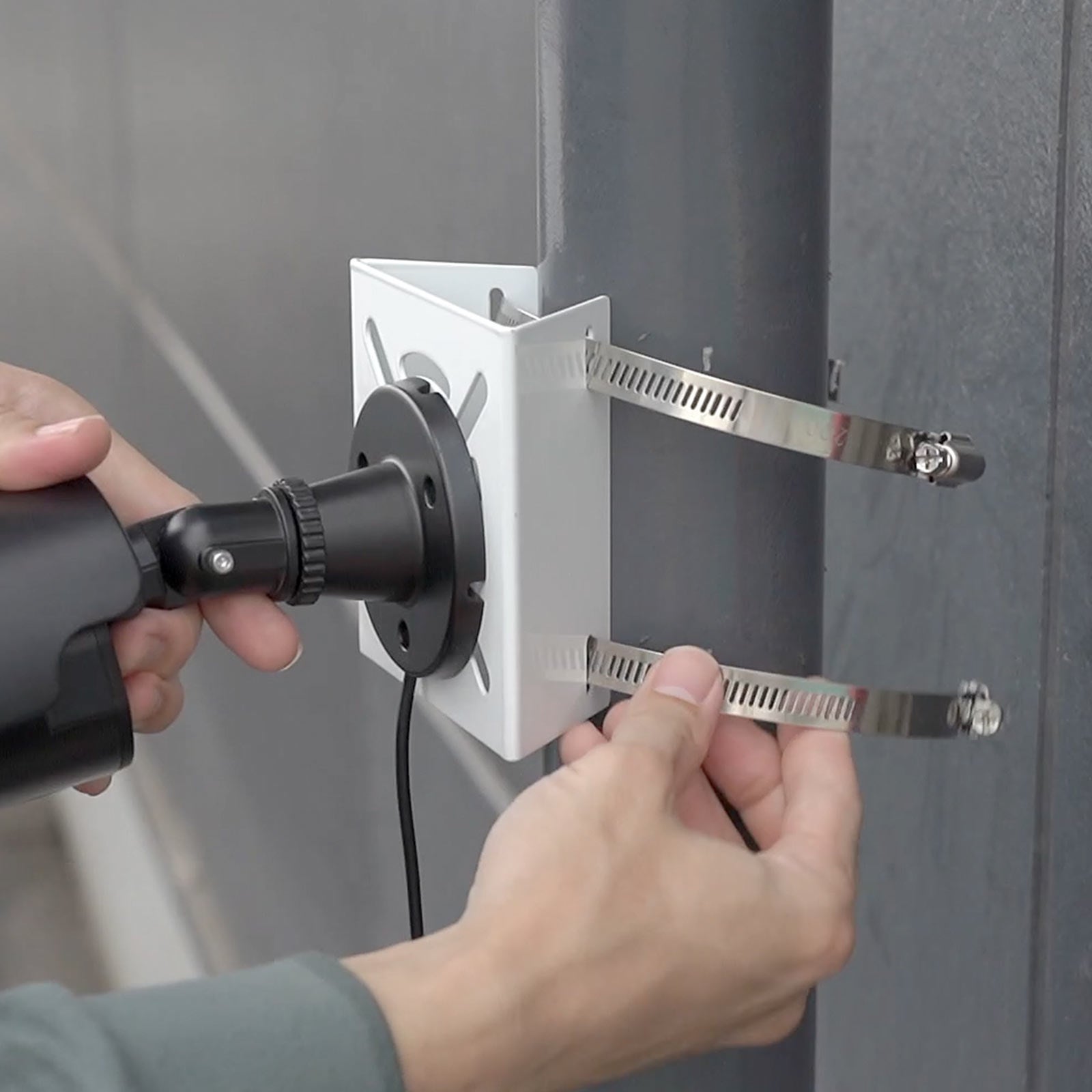 本製品は、防犯カメラやセンサーライトを穴を開けずに支柱に設置できる取り付け金具です。穴を開けないので、補修の必要がなく、工事不要で費用も節約することができます。