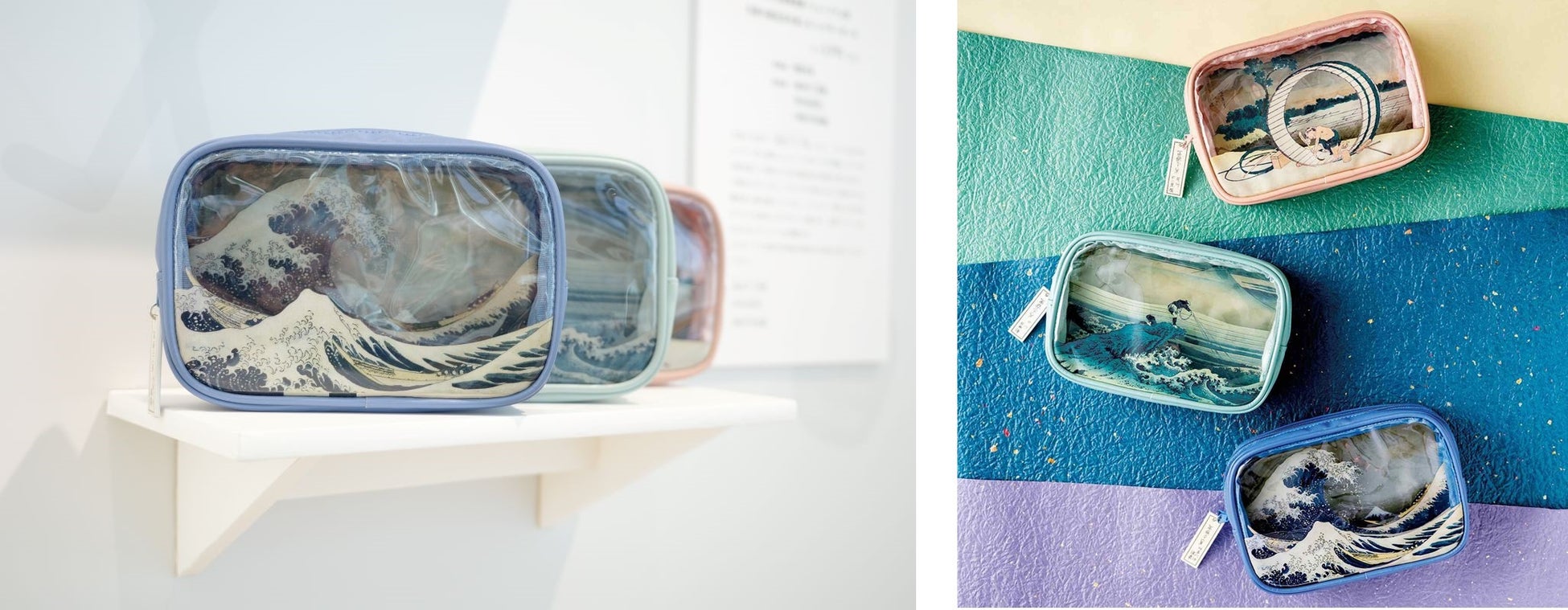 すみだ北斎美術館とのコラボレーション商品です。江戸の絵師・葛飾北斎が取り入れた「遠近表現」に注目し、作品をレイヤー状に表現した2層式のポーチです。デザインは「冨嶽三十六景」から、国内外でも人気の〈神奈川沖浪裏〉〈尾州不二見原〉〈甲州石班沢〉の3作品。暮らしの中で北斎が描いた景色を楽しめます。