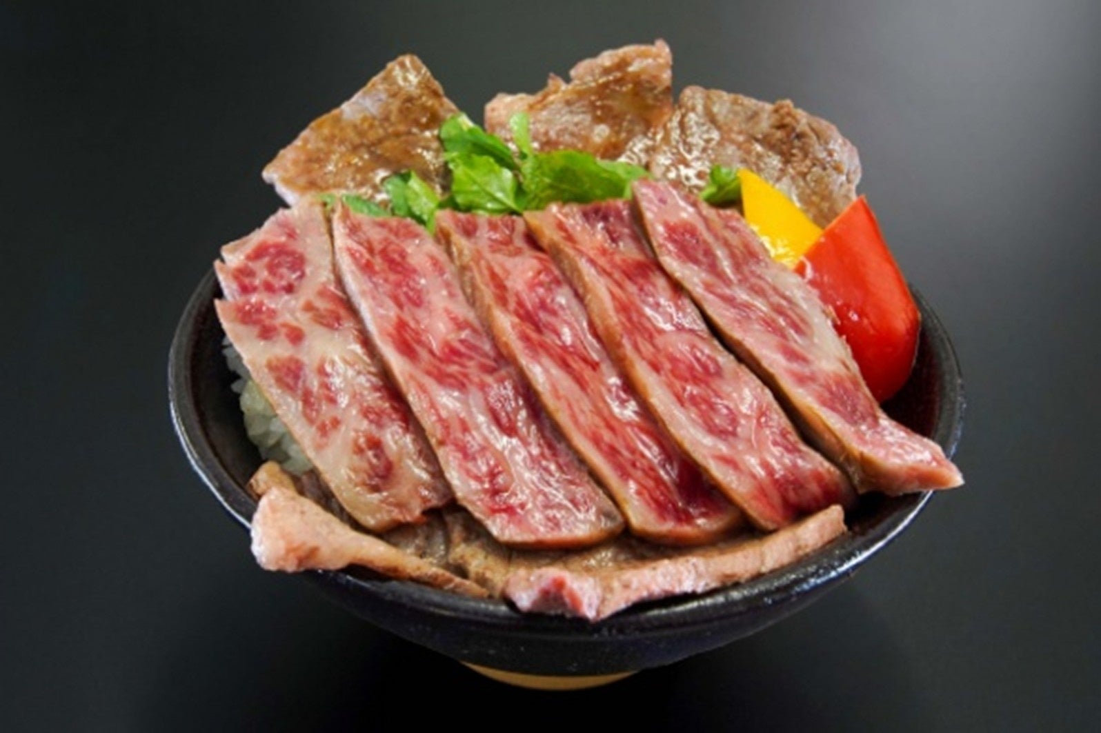 神戸牛ロースとカルビの焼肉の上には、贅沢に和牛霜降りステーキを載せました!