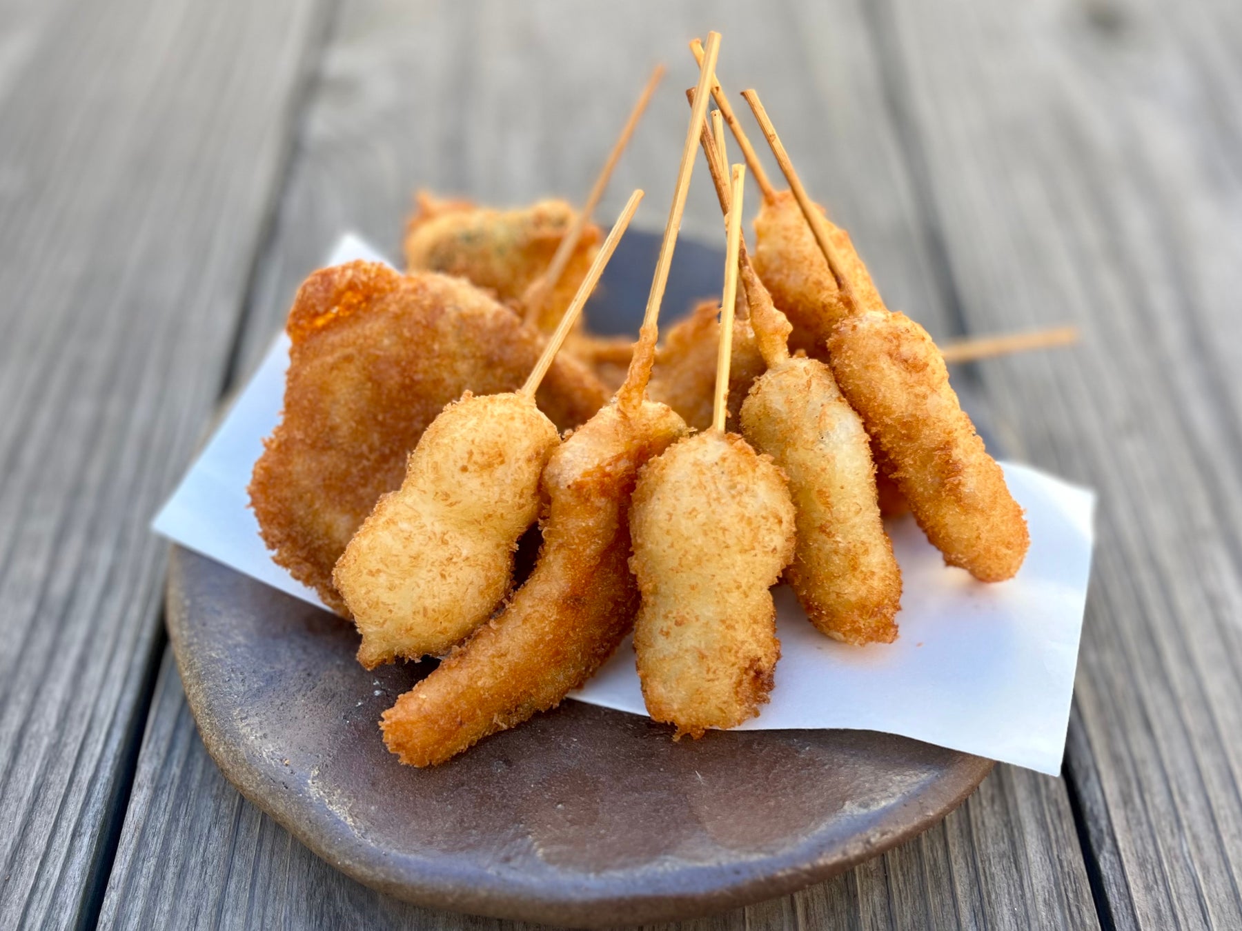 クロワッサン生地で巻いて揚げた串カツは、あっさり軽い口当たりで冷めてもサクサク美味しいのが特徴です。