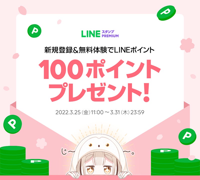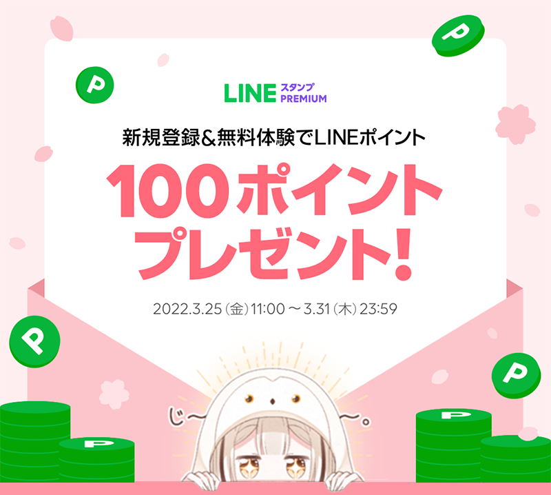 キャンペーン期間中に「LINEスタンプ プレミアム」の初回無料体験に登録してくださった方全員に、後日LINEポイント100ポイントを付与いたします。
