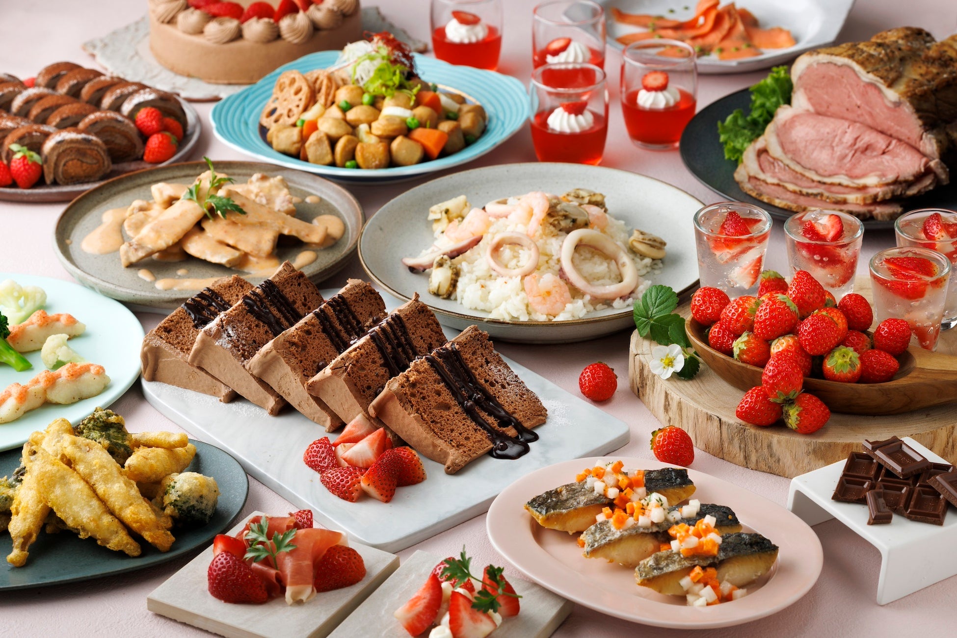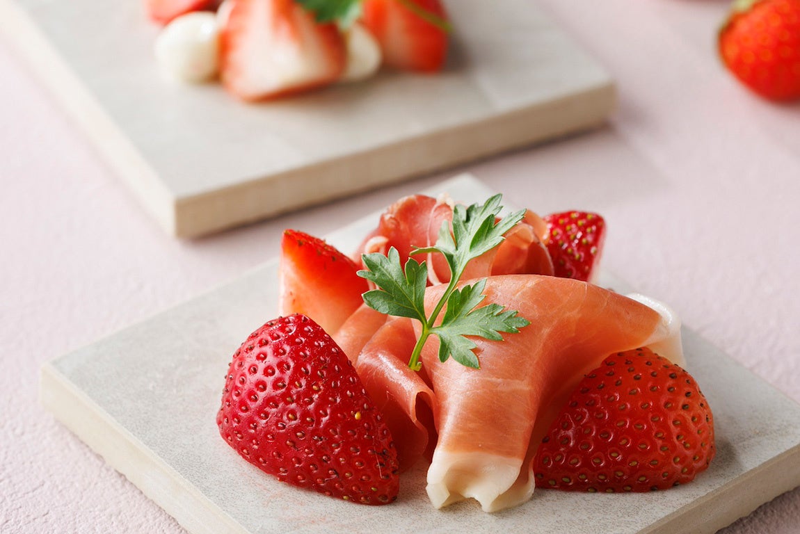 毎年、フレッシュいちごを食べ放題で提供する本フェア。本年は2月から第一弾、3月から第二弾と続き、5月までの期間にそれぞれのテーマに合わせたいちごデザートをご用意します。第一弾の2月は『ショコラに恋して』をテーマに、「いちごのショコラショート」をはじめ「いちごパイ」「チョコレートロール」など、いちごと相性の良いチョコレートを使ったデザートが登場します。「いちごと生ハムのマリネ」や「いちごのカプレーゼ」など、いちごを使用した料理もお楽しみいただけます。