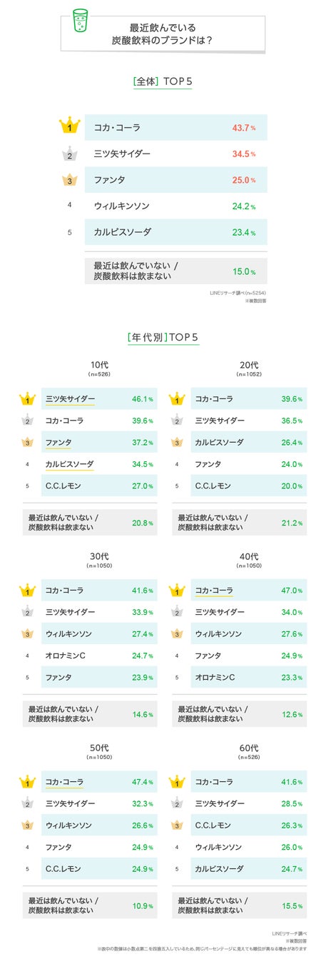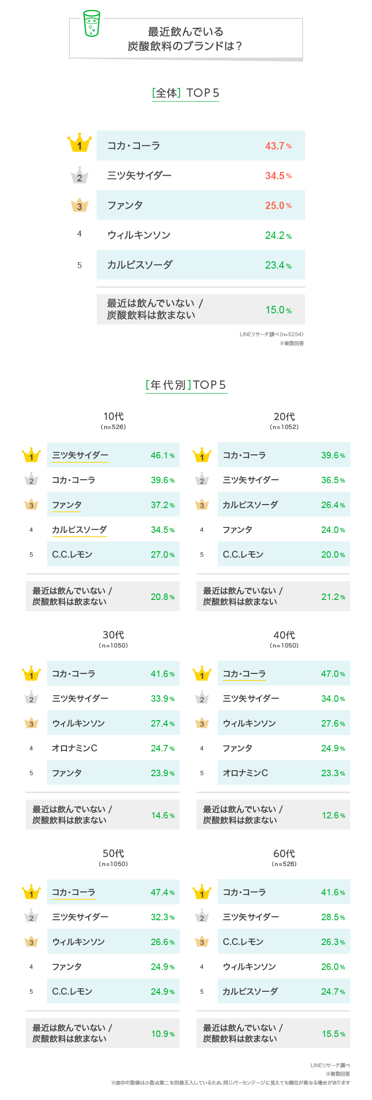 【LINEリサーチ】炭酸飲料が好きな人は全体で5割弱、最近飲んでいる炭酸飲料は「コカ・コーラ」と「三ツ矢サイダー」が上位にランクイン