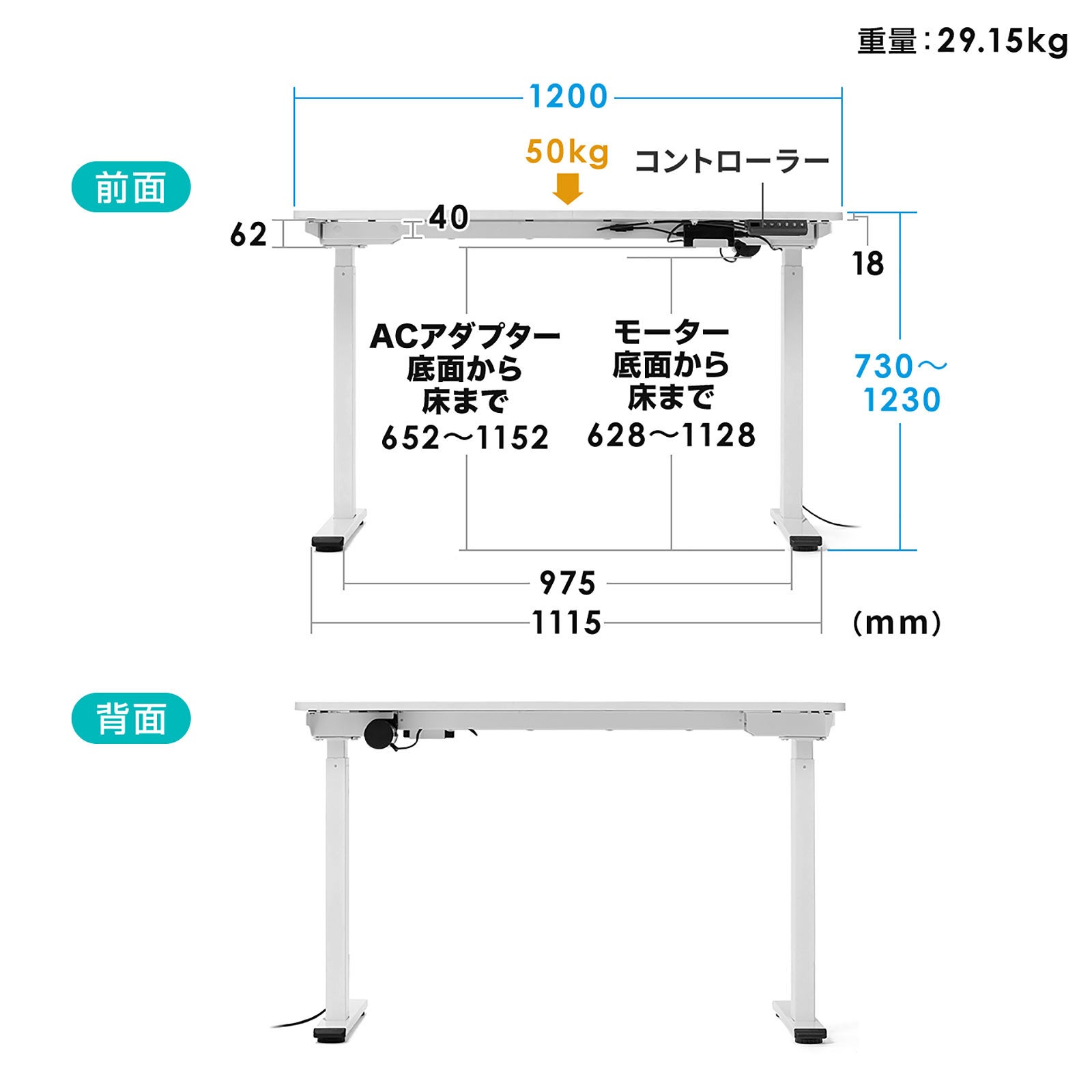 本製品のサイズは約W1200×D510×H730~1230mm、 重量は約29.15kgです。