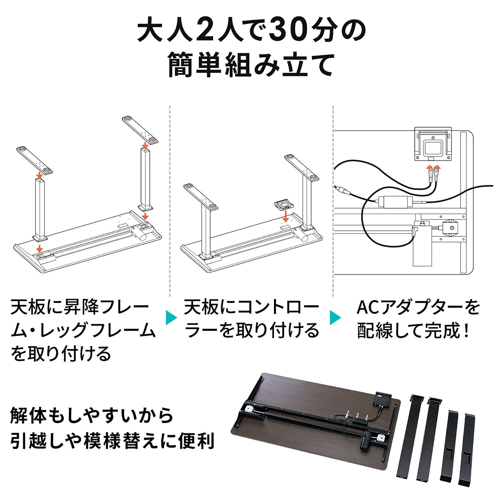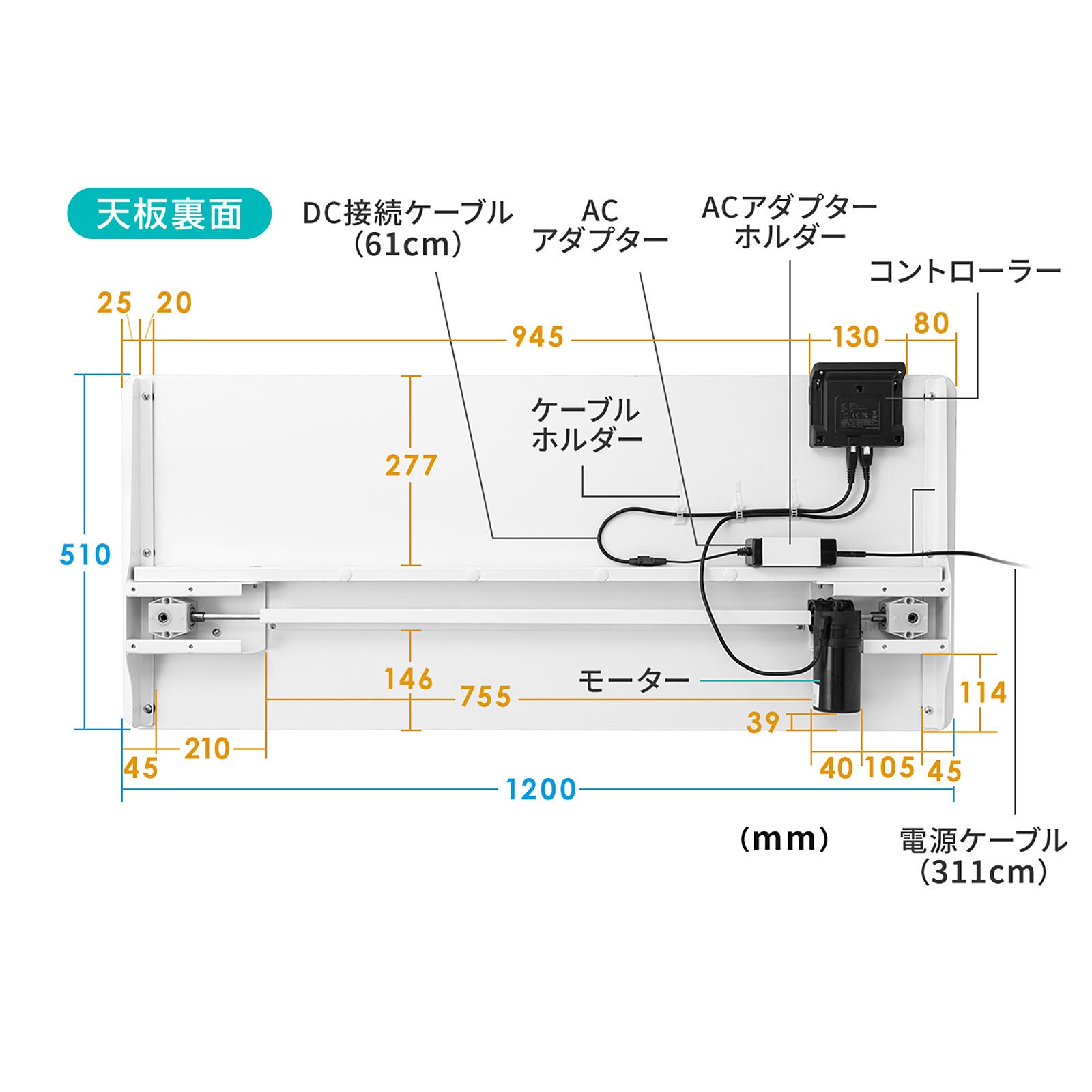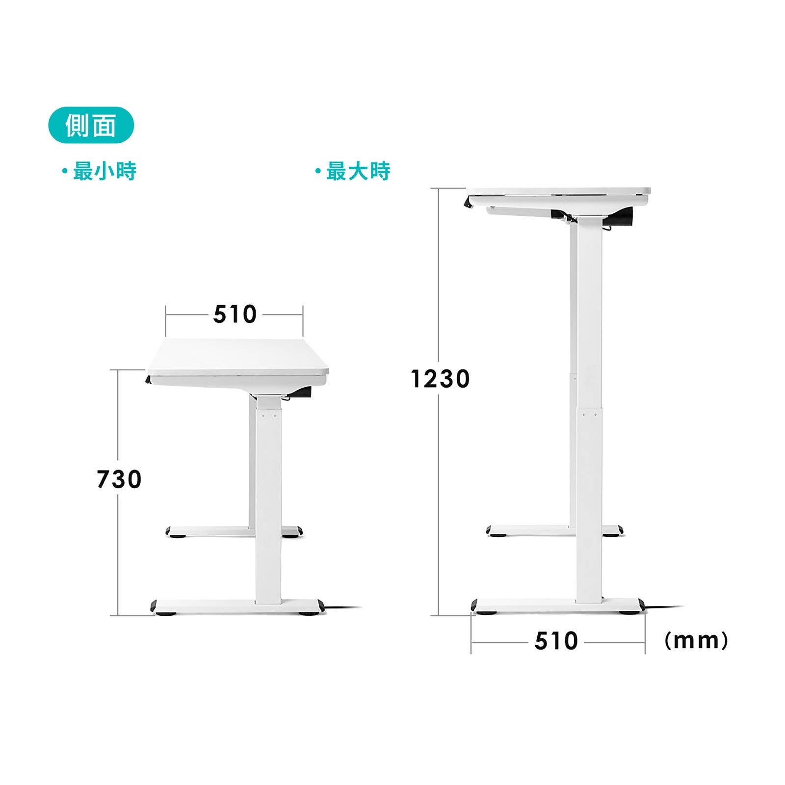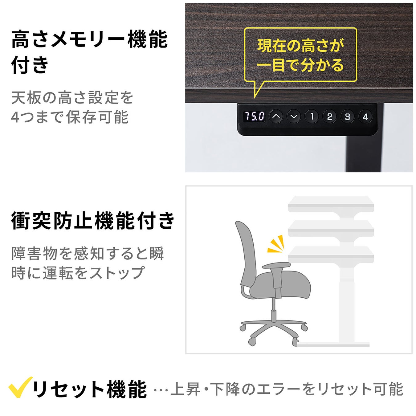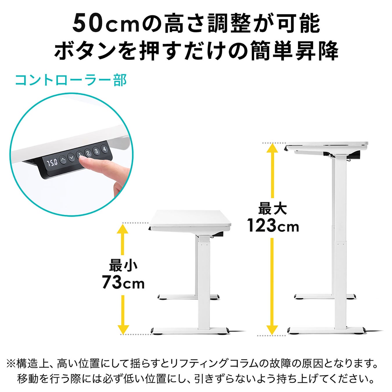 本製品は、電動モーター(1モーター)により天板位置を上下昇降させることが出来る電動昇降デスクです。天板の奥行きは510mmとなっており、省スペースに電動昇降デスクを設置することができます。