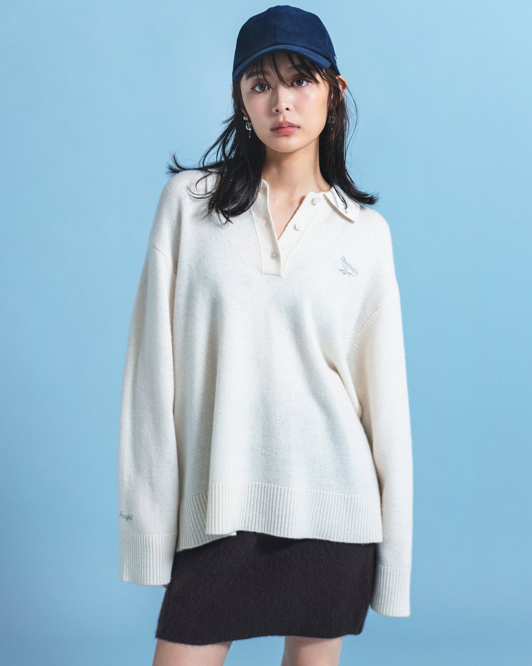 フィットネスにルーツを持ち、高品質でモダンなスタイルを提供するReebokとの初コラボレーション。スポーティなエッセンスにFRAY I.Dのモード感を掛け合わせた、全6型のウェア(ボアアウター、ポロニット、ラガーニット、ロゴスウェット、ニットフーディー、ミニスカート)と、雑貨アイテムを展開。雑貨はReebokの名作スニーカー「CLUB C」の別注モデルを中心に、リュック、ミニバッグ、キャップをラインアップ。