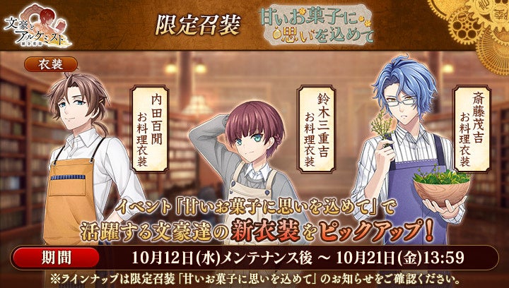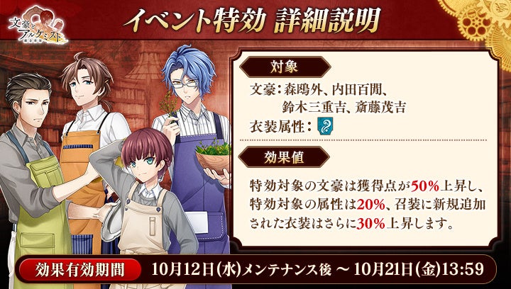 さらに、イベントと同時に開催される限定召装「甘いお菓子に思いを込めて」にて新規追加された「内田百閒」「鈴木三重吉」「斎藤茂吉」の〈お料理衣装〉を編成すると、得点の獲得率がそれぞれ30%上昇します。