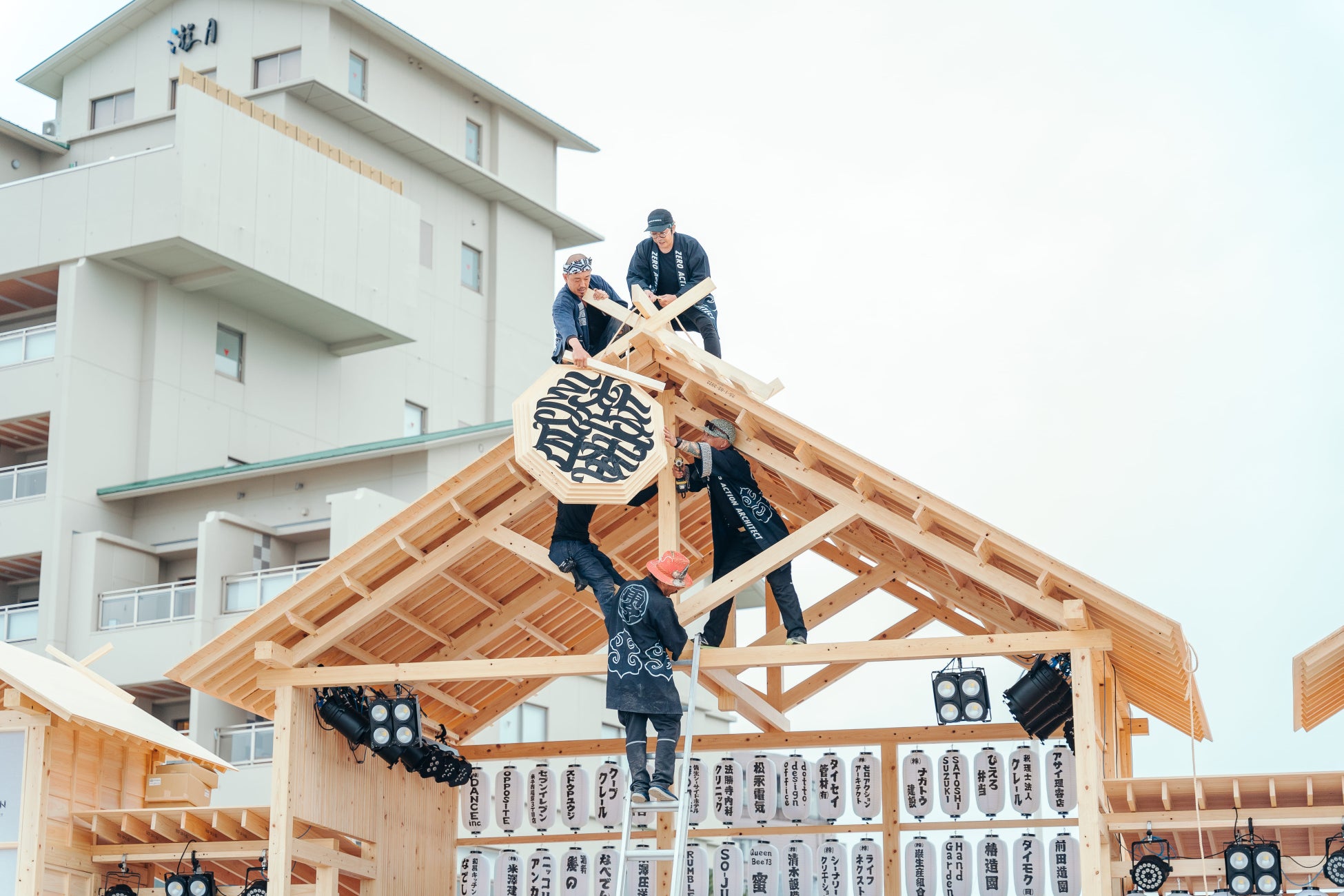2025年のフジロック・オレンジエコーにて、橋の下世界音楽祭チームと共に木工のステージを制作したZERO ACTION ARCHITECTによるアーチ状のオブジェが空間を彩ります。