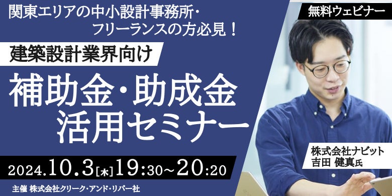 株式会社クリーク・アンド・リバー社(C&R社)は10月3日(木)、関東エリアの中小設計事務所やフリーランスの方を対象に、無料のオンラインセミナー「建築設計業界向け補助金・助成金活用セミナー」を開催します。