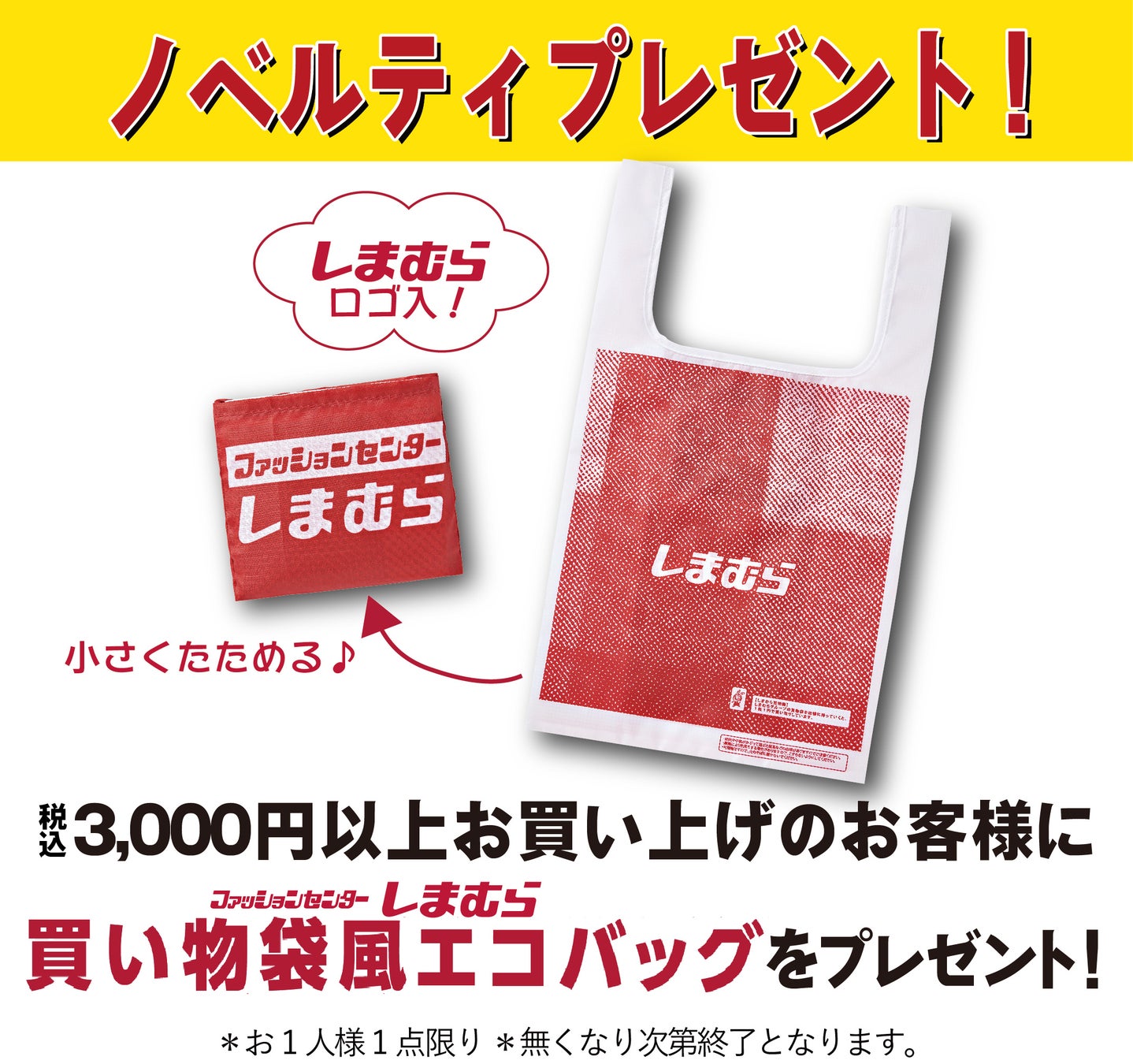 お買い上げいただいたお客さまに、小さく折りたためる「ファッションセンターしまむら」のロゴが入った、「買い物袋風エコバッグ」をプレゼントいたします。