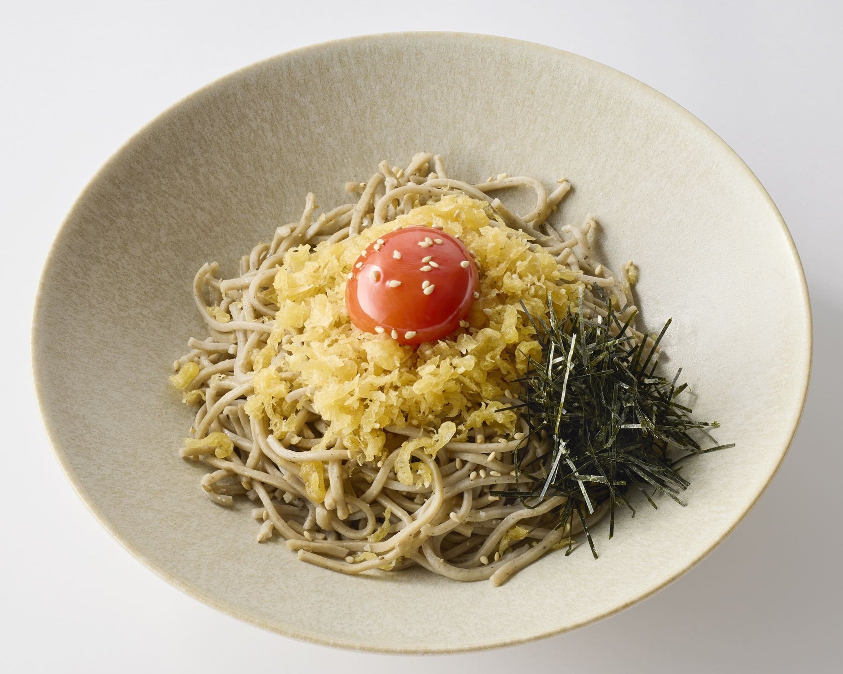 蕎麦の味わいが引き立つ、揚げ玉・黄味・海苔・ごま油でシンプルに