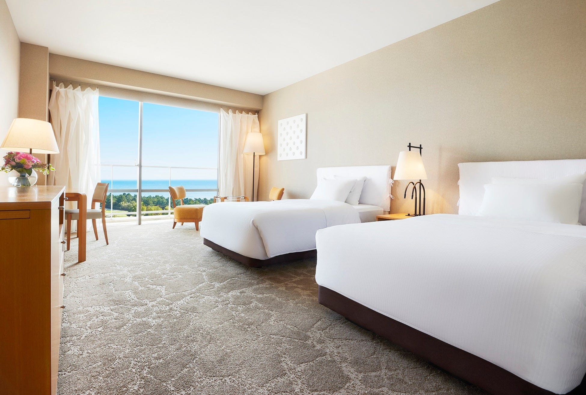 世界的な建築家、安藤忠雄氏が設計とグランドデザインを手がけた環境創造型施設「淡路夢舞台」の豊かな自然に佇む、グランドニッコー淡路。やわらかな陽光が差し込む客室には、窓の外に広がる青い海と空、緑に溶け込むような開放感あふれる空間が広がります。都会の喧騒を離れ、御食国「淡路」が誇る美食のおもてなしとともに、非日常の寛ぎを味わう特別なひとときをお過ごしいただけます。