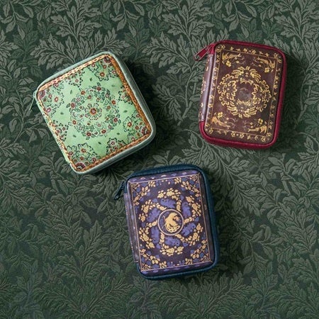 神仏に捧げる奉納品を収めたといわれている献物箱(けんもつばこ)の豪華絢爛(ごうかけんらん)な細工がほどこされた箱の模様を、イラストにしてデザインしたポーチです。コスメや常備薬を入れたり、モバイル小物の持ち運びに使ったりするのにちょうどいい小さめサイズ。印象の違う3種類のデザインは、集めて小物の整理整とんなどをするのに役立ちます。