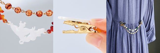 螺鈿の輝きをほうふつとさせるシェル風素材。針を使わないクリップタイプなので簡単に着脱可能です。ゆったりしたお洋服の背中をつまんで、シルエットをすっきり調整。