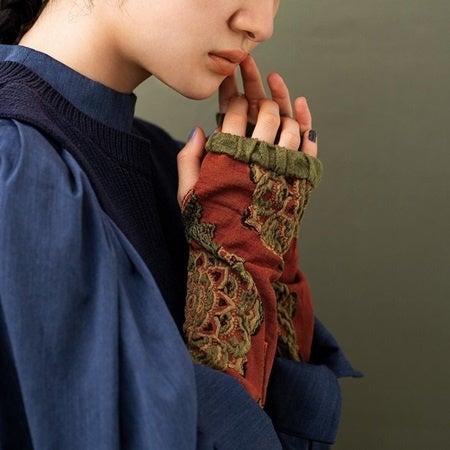 聖武天皇の一周忌、国家安泰を祈る法要で掲げられた旗の、優美な文様がデザインされたハンドウォーマーです。