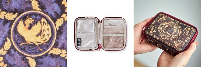 絢爛豪華な細工をイラストにし、プリントで表現しています。ファスナーを開くと、内側にはポケットが4つもついています。メッシュのポケットは中身が見やすいので、大事なものを入れておくのに便利です。薄型で小ぶりなサイズはバッグに入れて持ち歩くときもかさばらなくて◎。