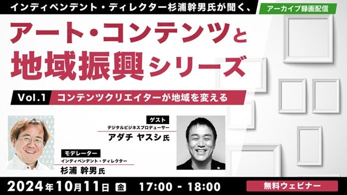 株式会社クリーク・アンド・リバー社(C&R社)は10月11日(金)、アートやコンテンツを活用した地域振興に関心がある地域企業や自治体職員の方、コンテンツクリエイター、コンテンツ企業の方などを対象に、今年5月に開催したオンラインセミナー「インディペンデント・ディレクター杉浦幹男氏が聞く、アート・コンテンツと地域振興シリーズvol.1~コンテンツクリエイターが地域を変える~」のアーカイブを無料配信します。