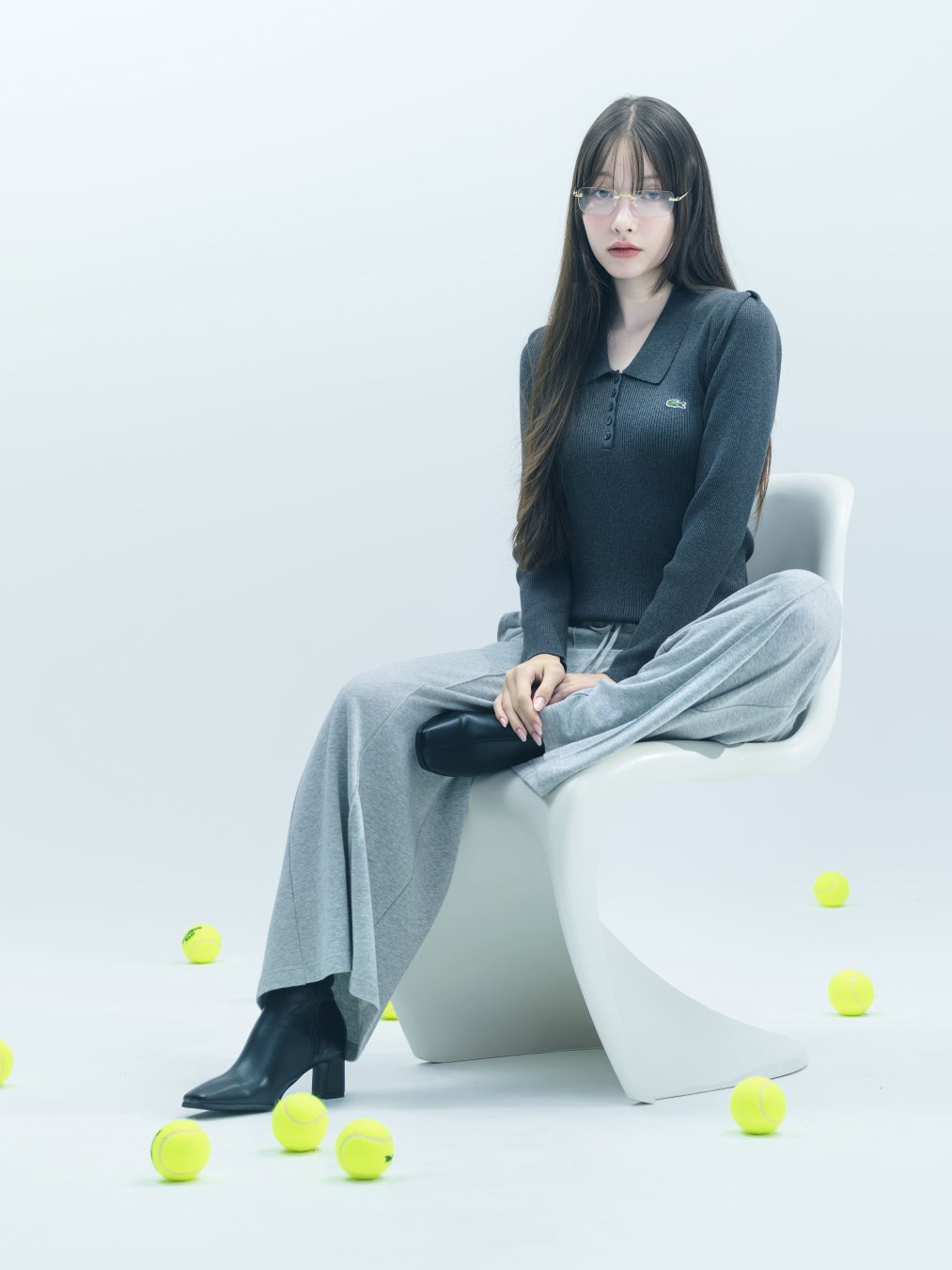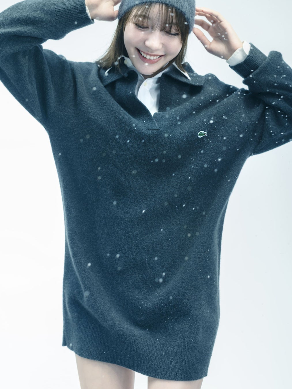 ラメ糸を織り込んだ生地がさりげない華やかさをプラスし、胸元の「LACOSTE」ワニロゴが高級感を添えます。