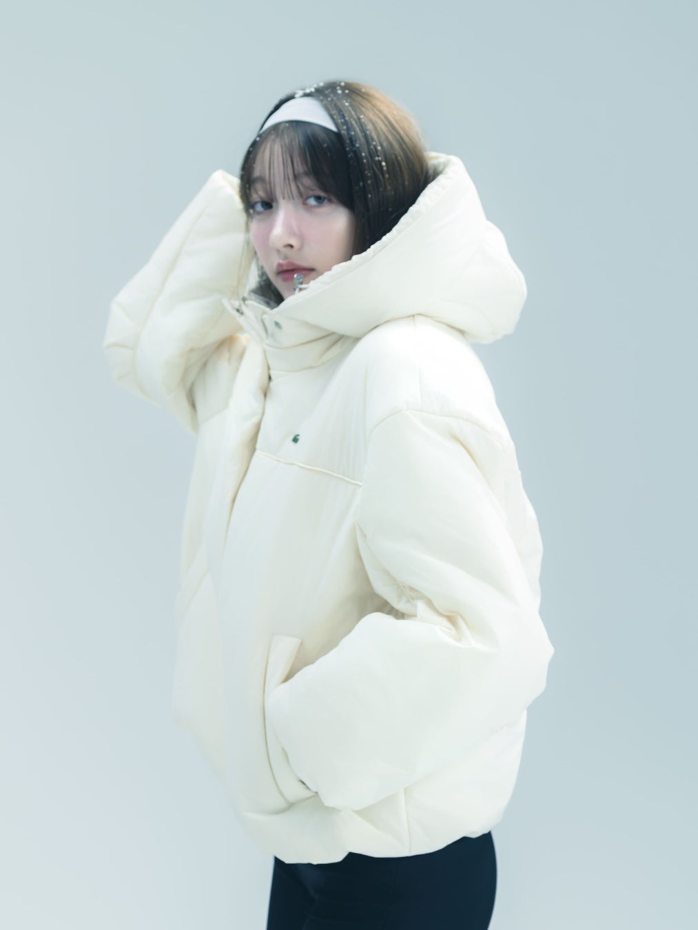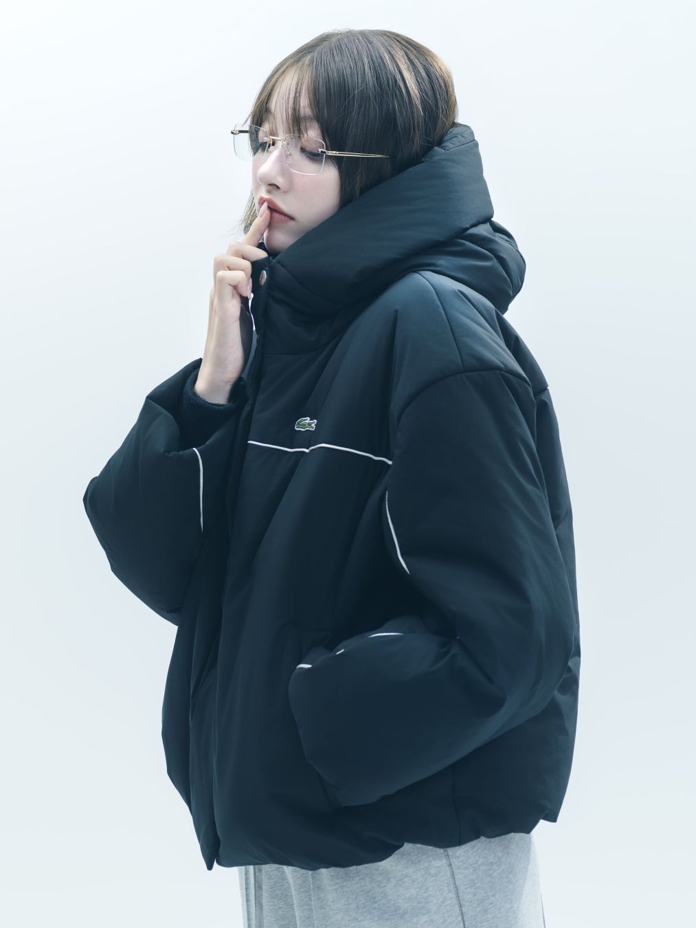 身頃から袖口にかけてのラインが印象的なフード付き中綿ブルゾン。