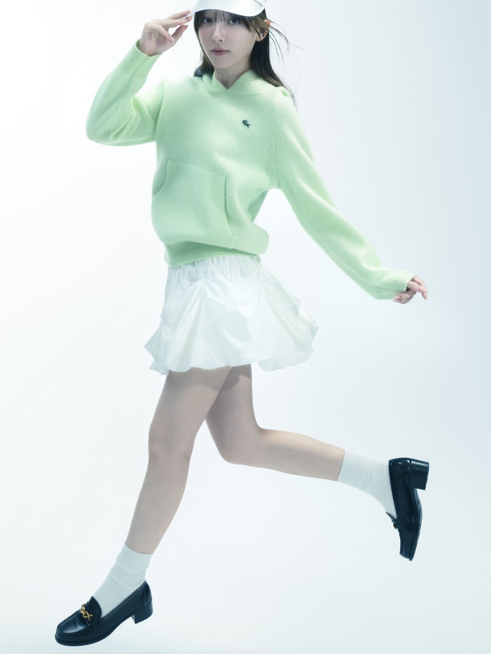 ミニスカートやスウェットパンツなど幅広いボトムスと相性が良く、冬のスタイリングに軽やかさをプラスします。