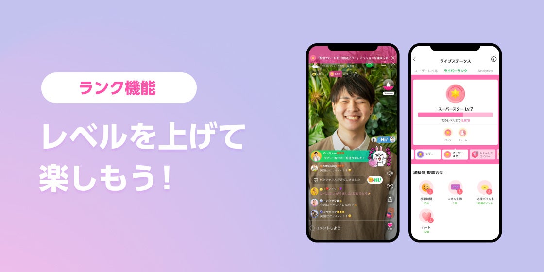 リスナーランクでもらえていたバッジ、フレームなどの報酬はそのままに、LINE LIVEでプレスする(配信、視聴、応援など)ほど、レベルが上がる仕組みにアップデートされました。ユーザーレベルは、リスナーとしての活動だけでなく、ライバーとしての活動でも上がっていきます。