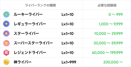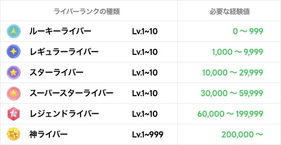 *「ユーザーレベル数」%:(例)ユーザーレベル100とすると、ライバーランク経験値に100%のボーナスが付与される