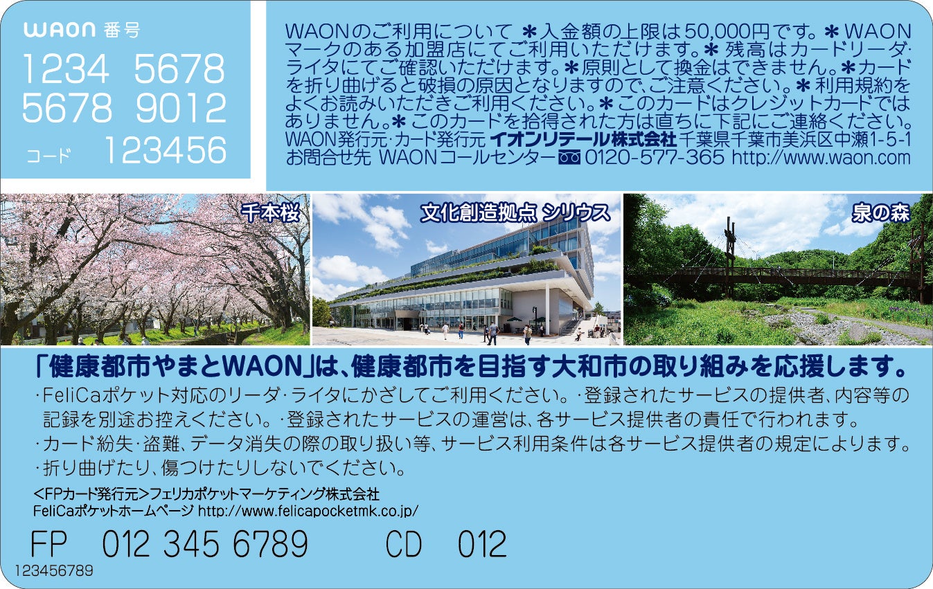 本協定の取り組みの一環として、イオンは協定締結日より、ご当地WAON「健康都市やまとWAON」を発行します。カードの表面には、大和市が男女サッカーリーグのホームタウンなどに認定・承認を受けているなどサッカーにゆかりがあることから、同市のイベントキャラクター「ヤマトン」がサッカーのユニフォームを纏い、「健康都市やまと」の実現へのイメージを券面デザインに表現しています。
