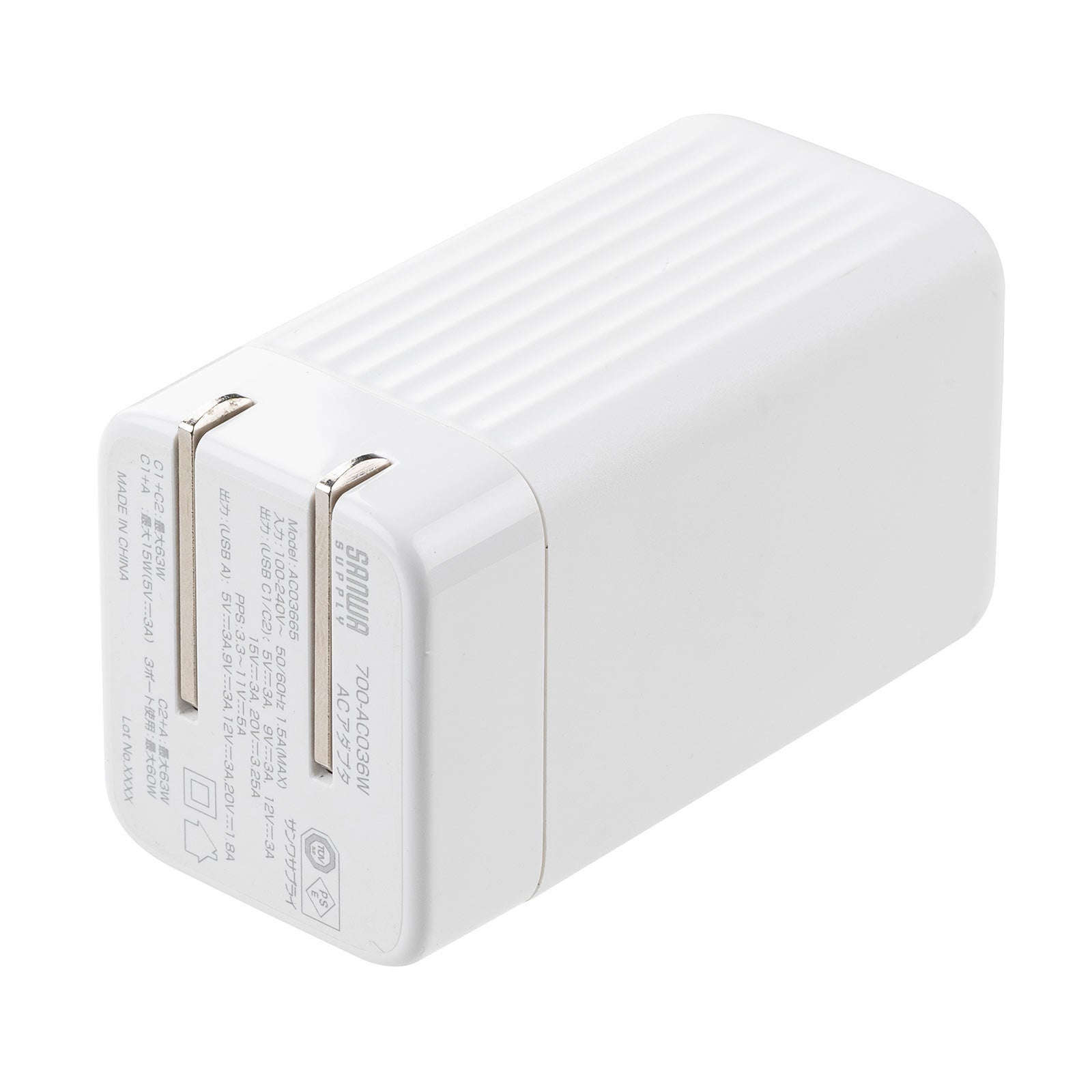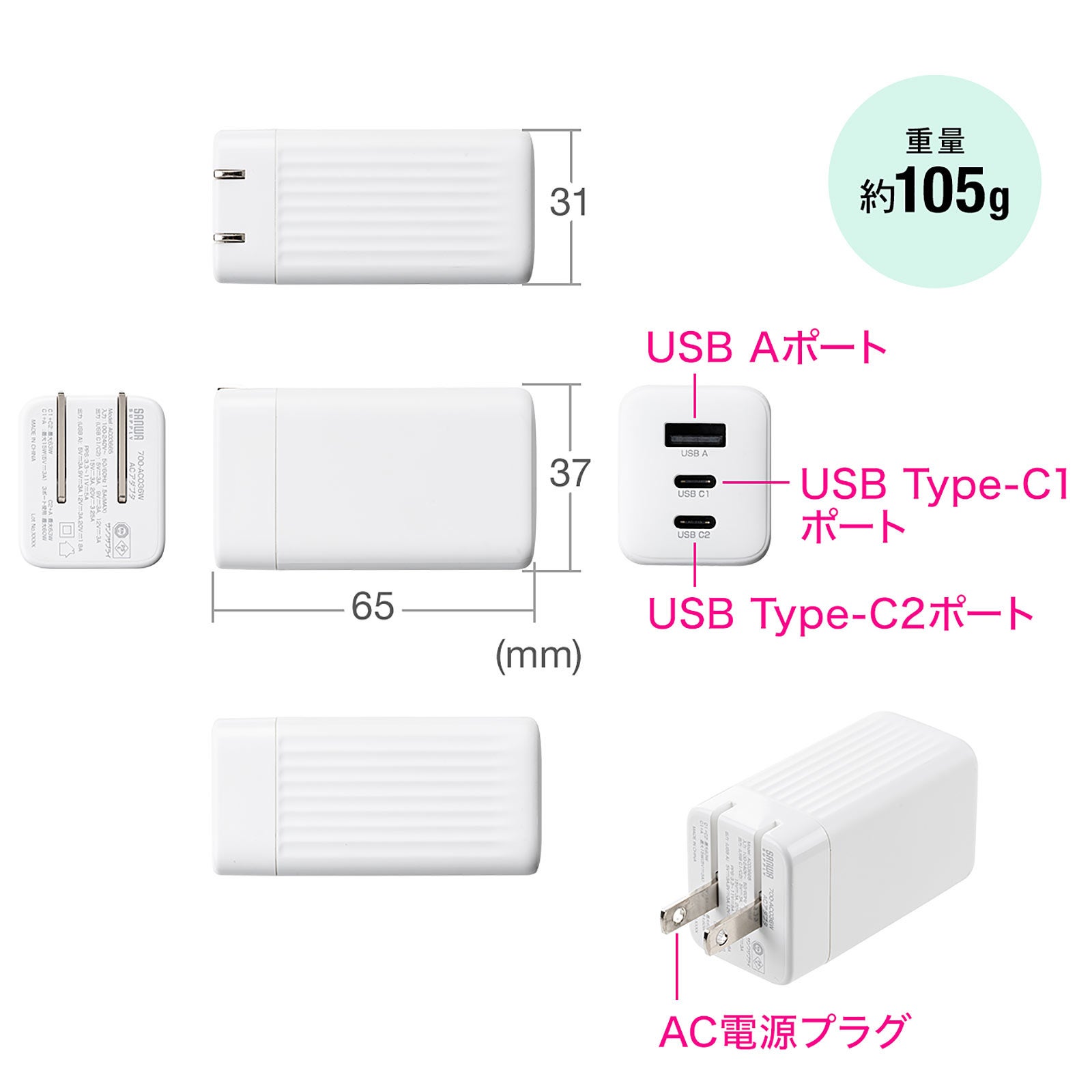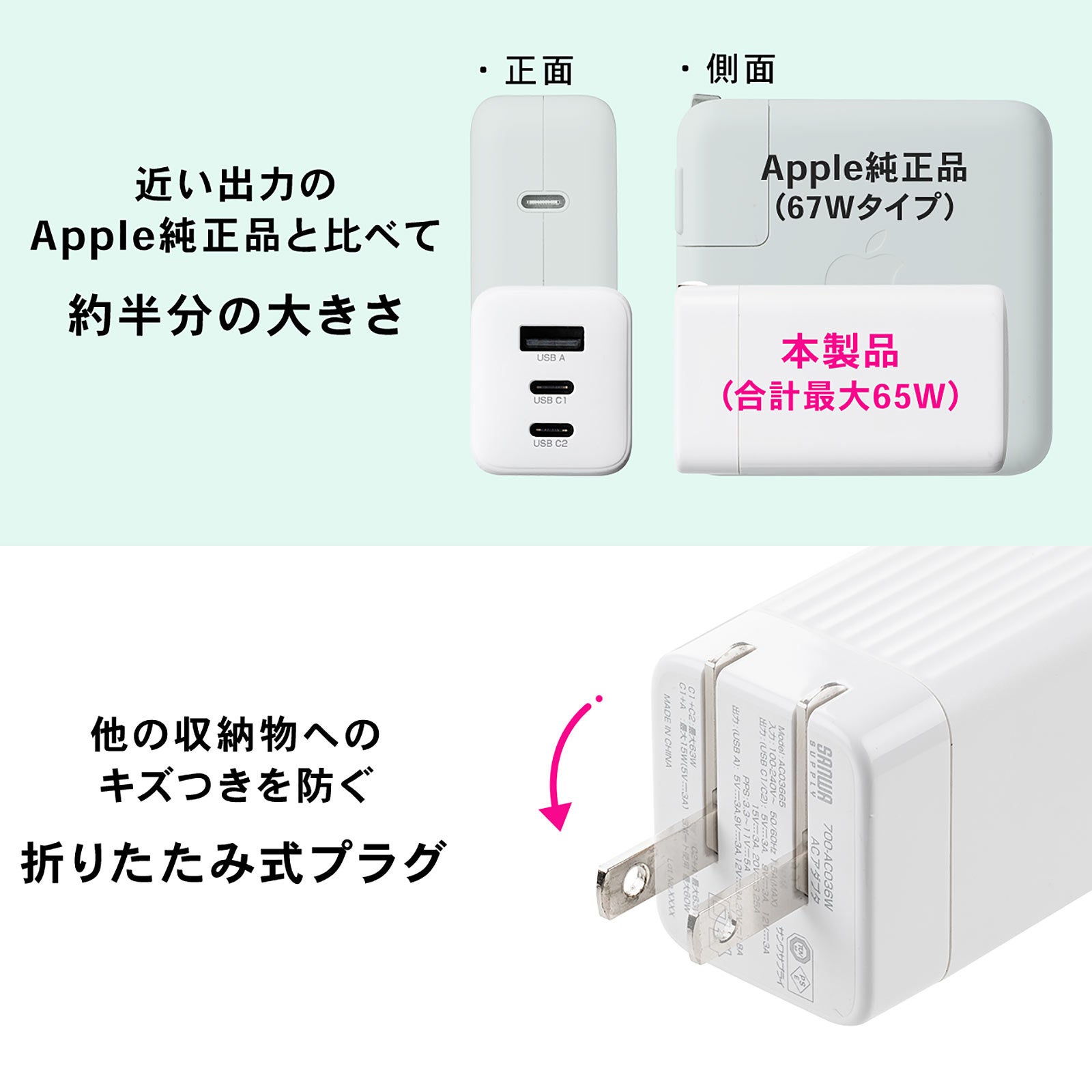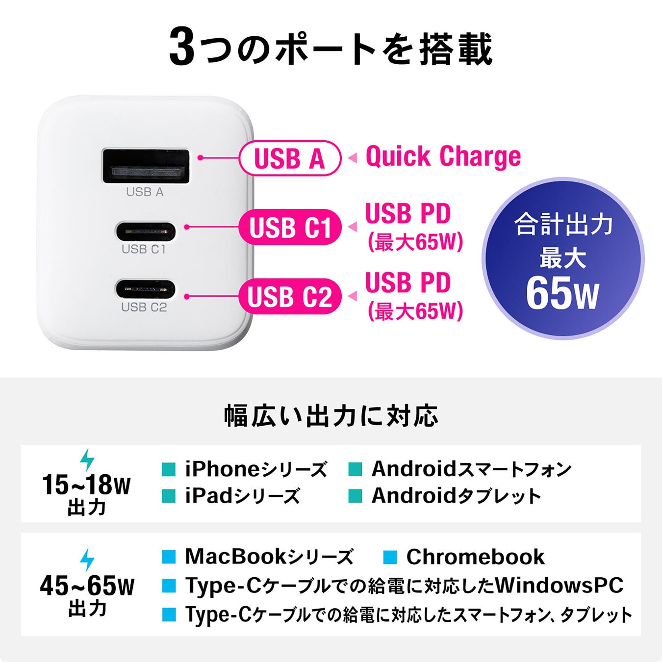 USB-C充電器 PD 充電器 65W USB-A & USB-C 3ポート GaN窒化ガリウム 折りたたみ式プラグ 急速充電 ノートパソコン ホワイト