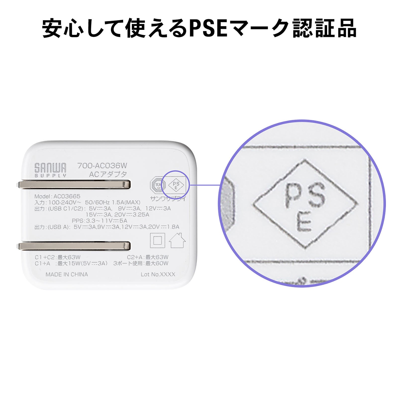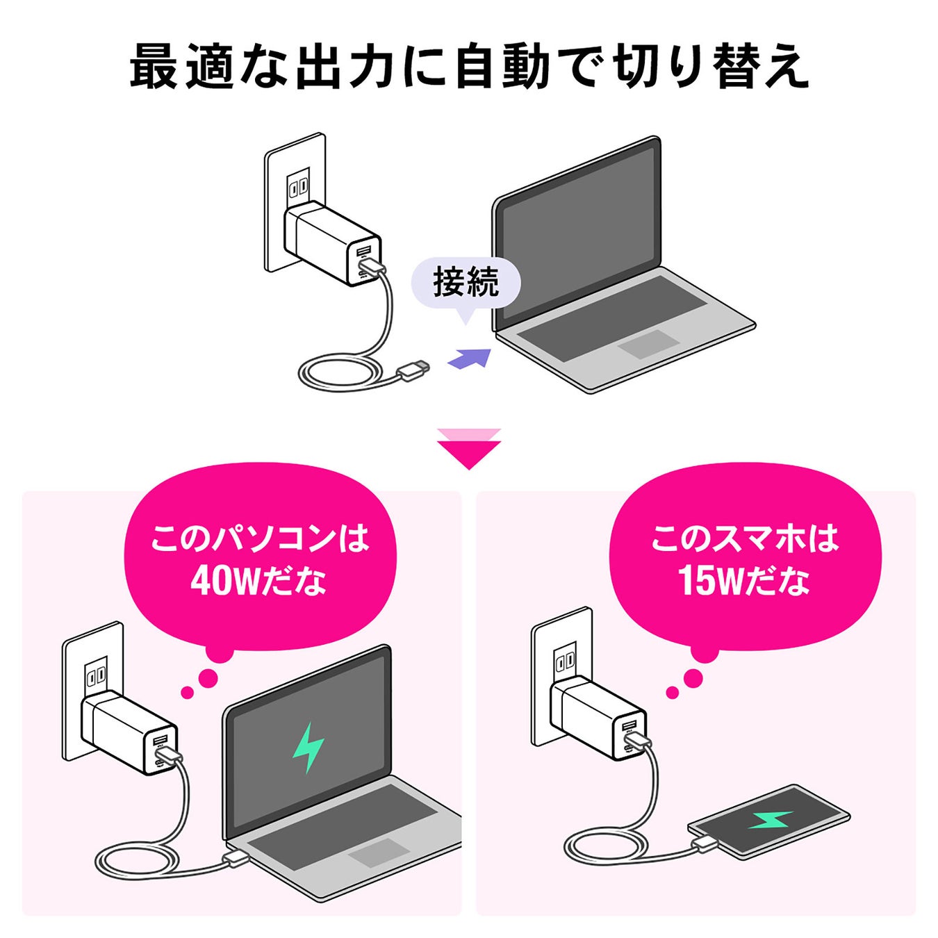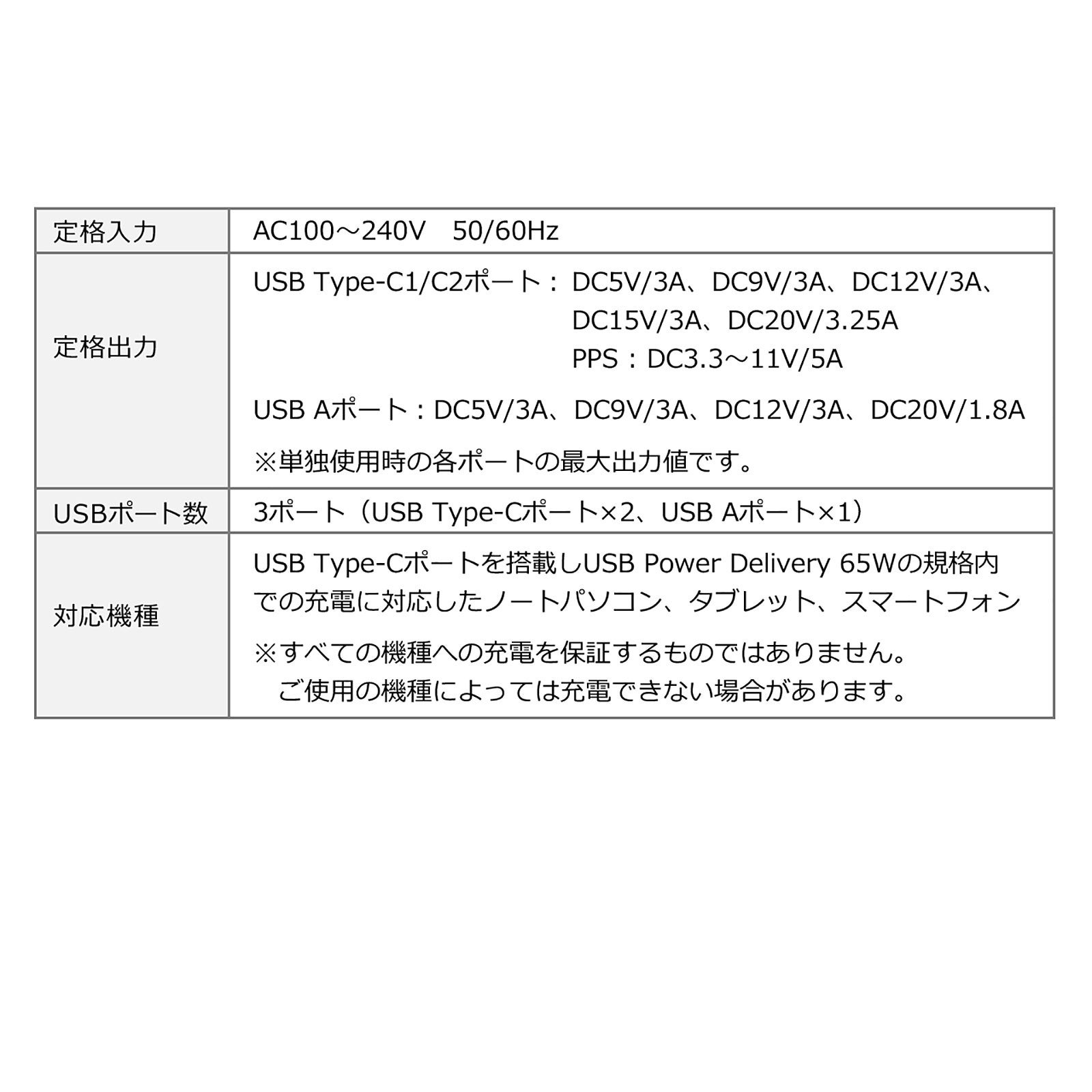 本製品は、最大65WまでのUSB PD規格による充電に対応したUSB充電器です。