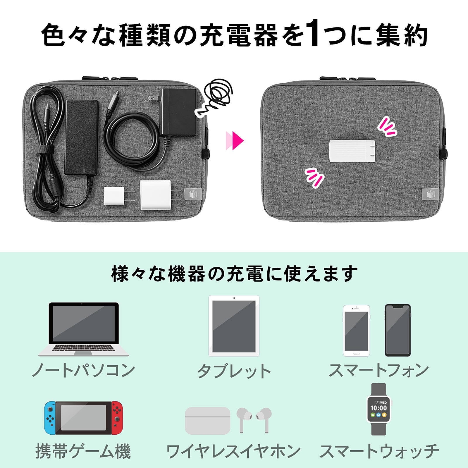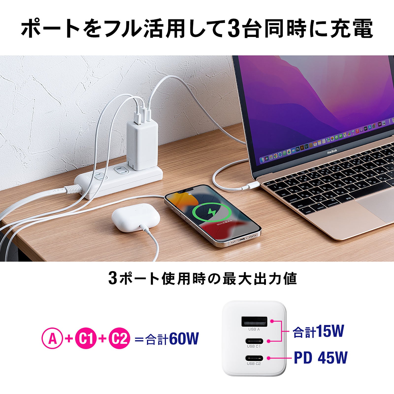 USB Type-Cを2ポートとUSB Aポートを1ポート搭載した合計3ポート仕様で、様々な機器の充電に対応し最大3台の機器を同時に充電することができます。さらに、急速充電に対応しておりiPhone13などの対応機器への急速充電が可能です。