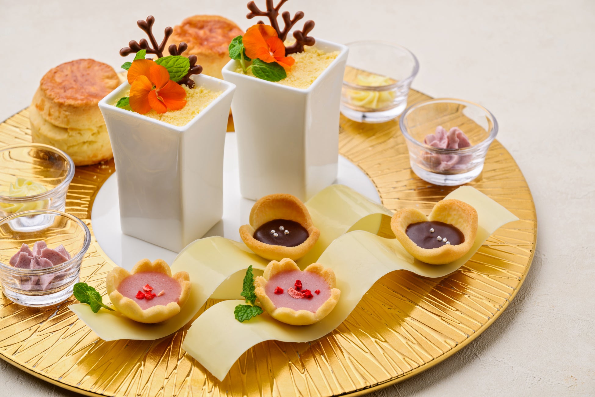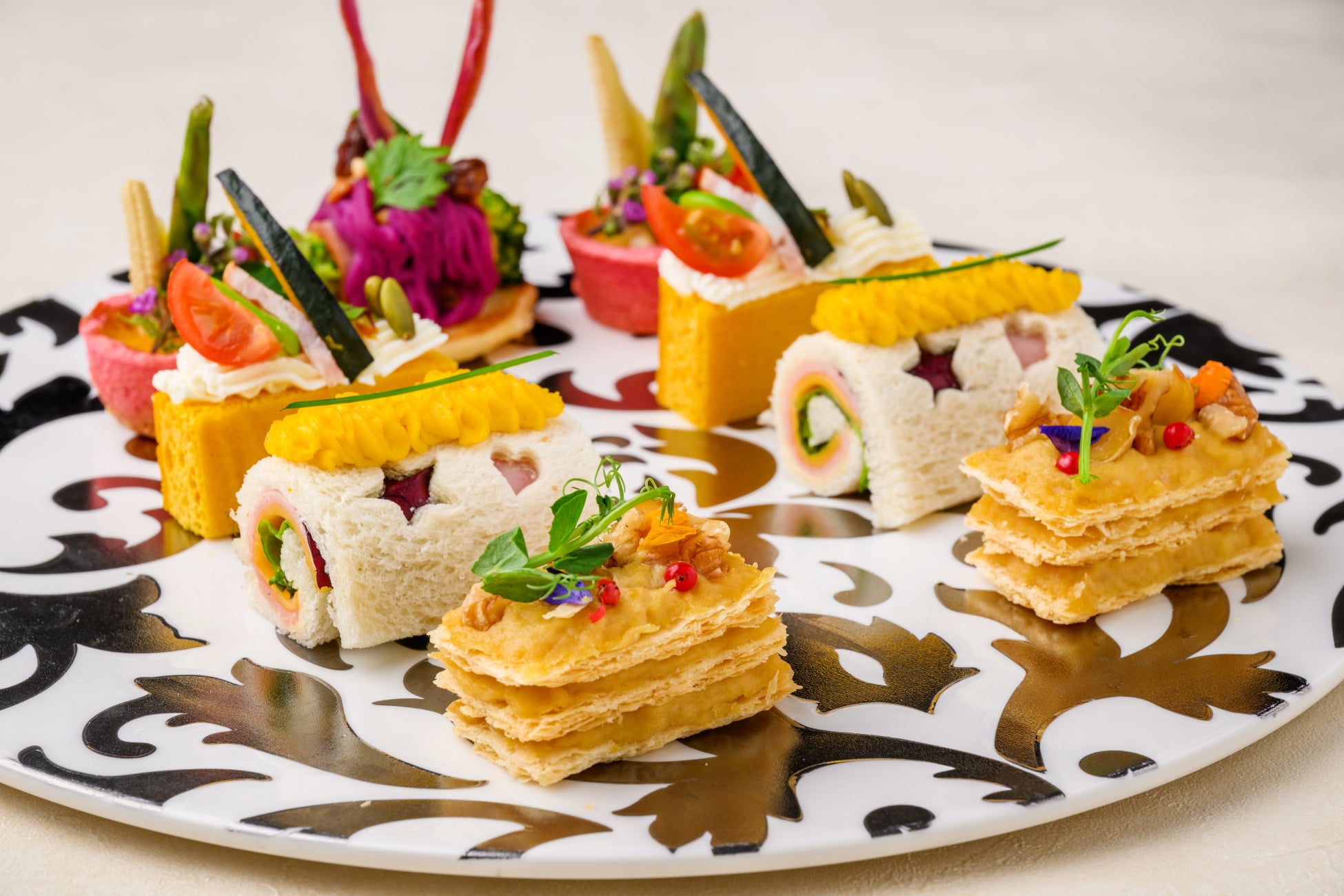 パティオを客室から見下ろした風景をイメージした1stプレートには、噴水やプランターに並べられた草花をモチーフにしたセイヴォリーをご用意。紅芋フライとローストしたピーナッツで噴水の水しぶきを表現している「紅芋モンブランサラダのブリ二」は、中に隠れている合鴨スモークがアクセントになっています。「フムスのミルフィーユ」はひよこ豆とゴマの風味を、「アスパラガスとベーコンのキッシュ」はアスパラガスやカリカリベーコン、ベビーコーンの食感を楽しめます。かぼちゃの優しい甘みが広がる「かぼちゃのケークサレ」にはそら豆とトマトをトッピングし、色鮮やかに仕上げました。ハートや星形のくり抜きが可愛らしいロールサンドは、ホットティーと一緒にお召し上がりください。