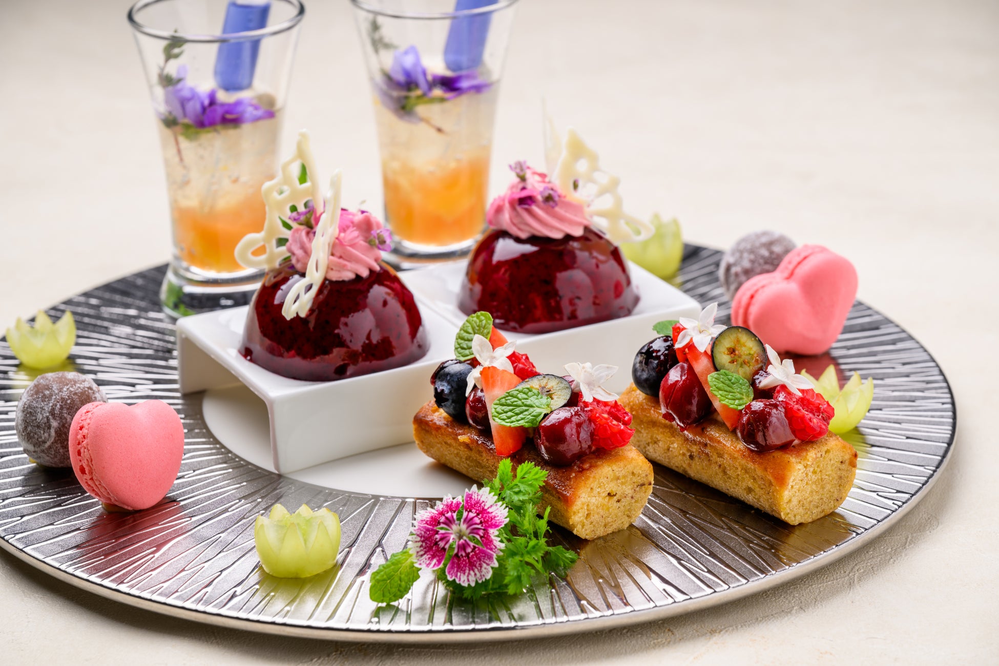 「チェリーベリーのピスタチオケーキ」は、3種類のベリーとチェリーの味を楽しめる一品。花の香りに誘われた蝶をイメージしたホワイトチョコレートをあしらった深紅のブルーベリームースの中には紅芋クッキーが隠れています。バタフライピーシロップにより色が変化する「グレープフルーツとレモンのジュレ バタフライピーシロップ添え」は、柑橘系の爽やかな香りと甘さが楽しめます。「ローズジャムのマカロン」と「さんぴん茶ガナッシュのトリュフ」は、コーヒーとの相性が抜群です。