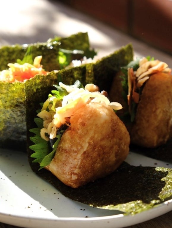 苦楽園口駅前と甲東園で人気の玄米揚げおにぎり専門店です。モチモチに炊いた玄米おにぎりを米油で揚げて、こだわり抜いたおいしいお醤油をまぶしています。外はカリッと、中はもっちり、お醤油の旨味と香ばしさが広がります。