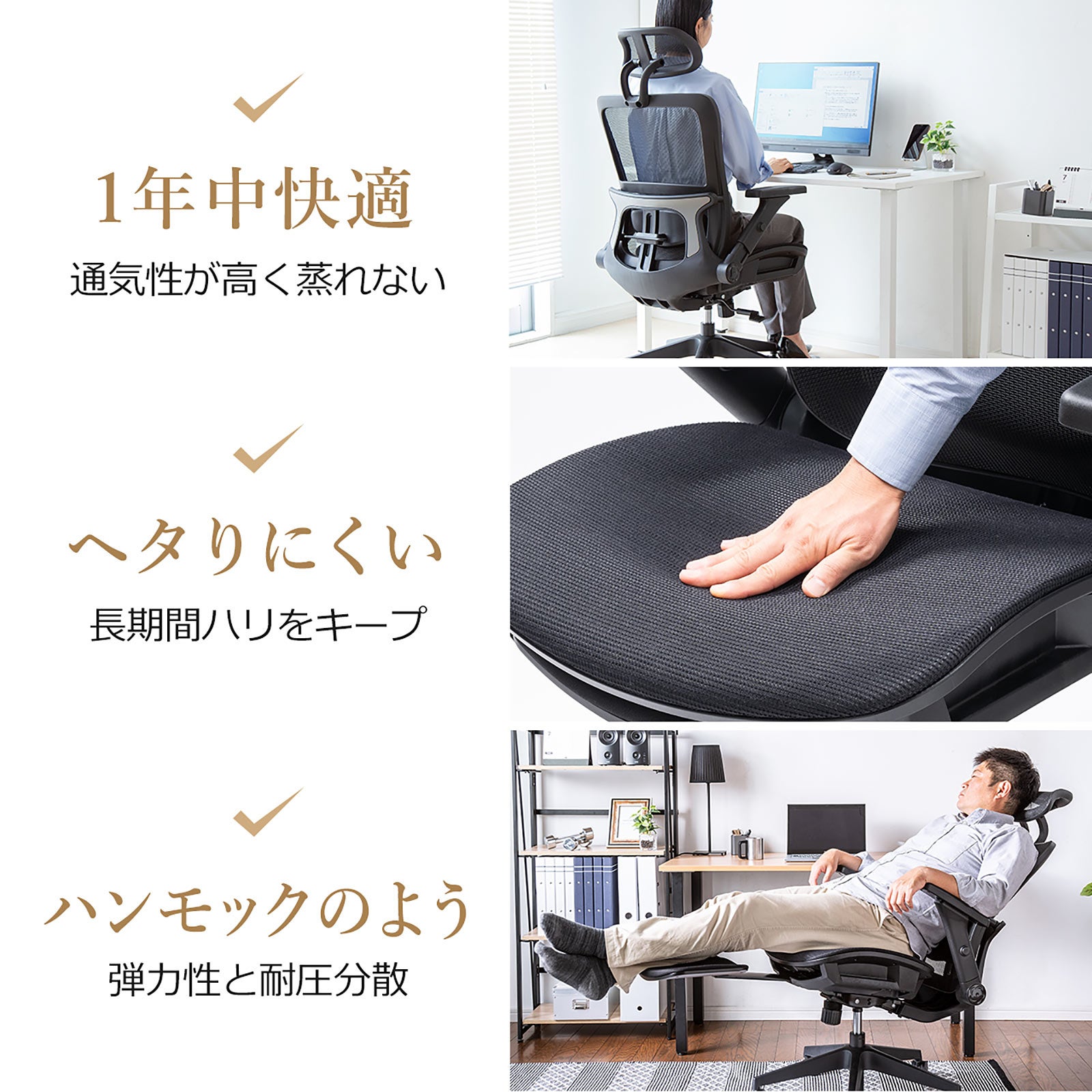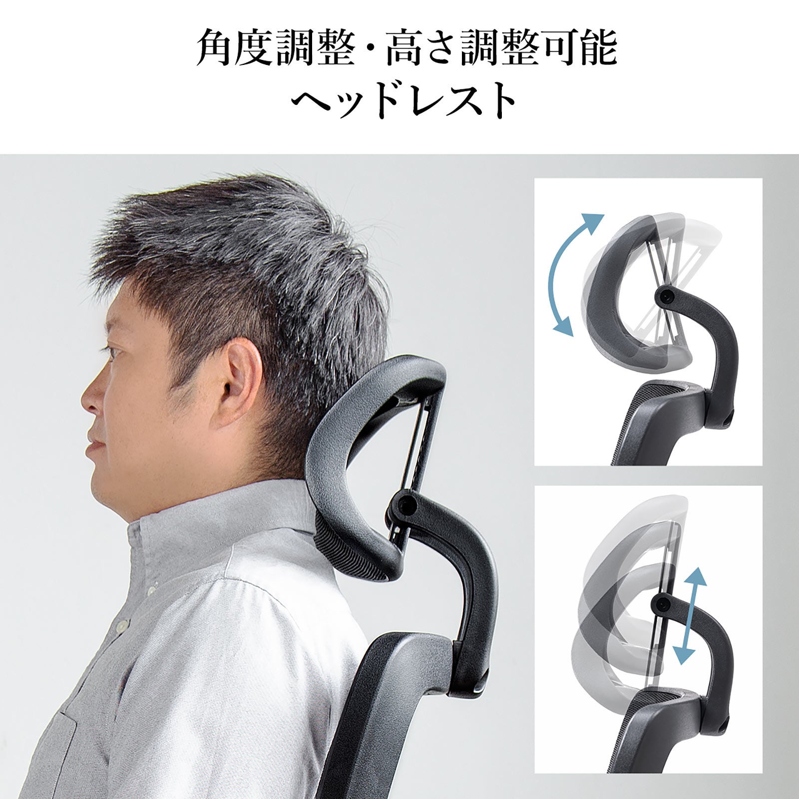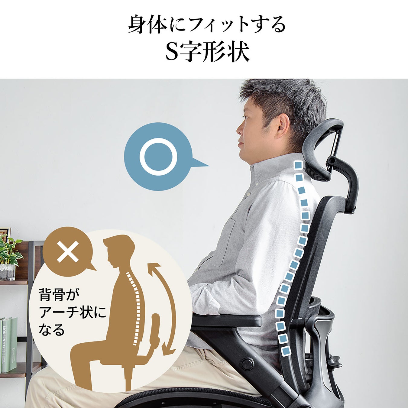 本製品は、背もたれ、座面、ヘッドレストにメッシュ生地を採用した通気性に優れたオフィスチェアです。