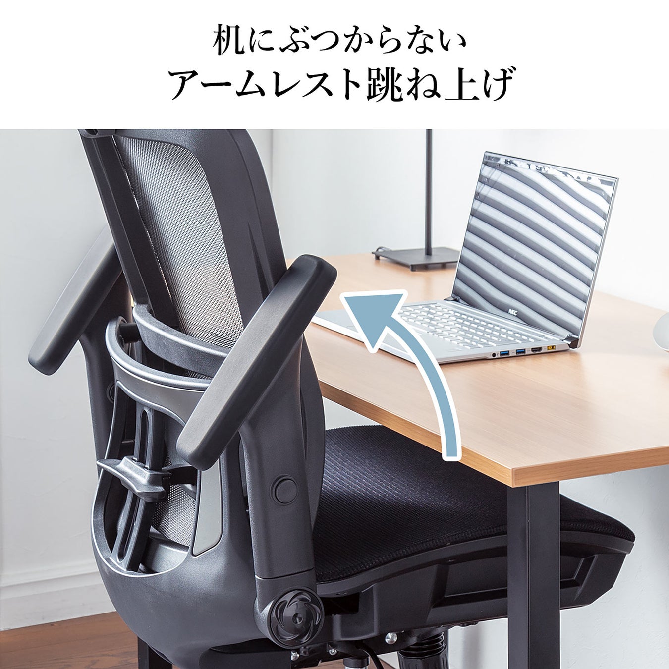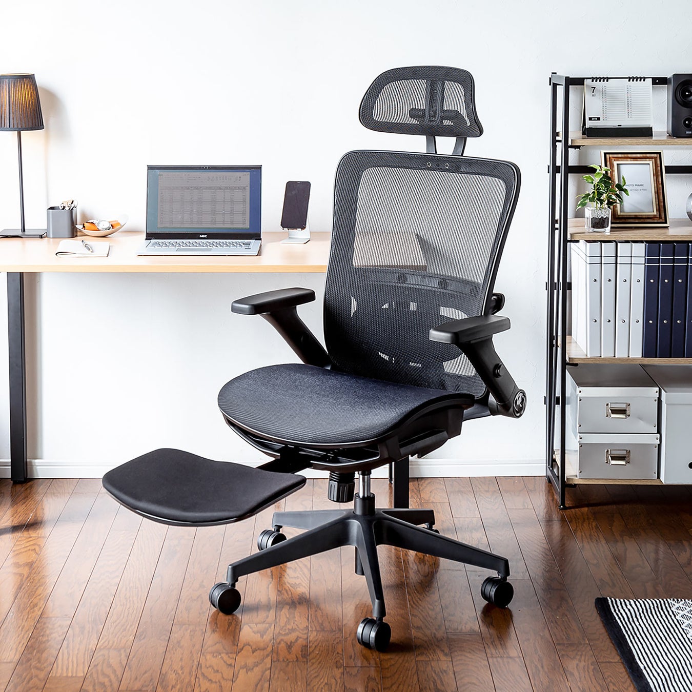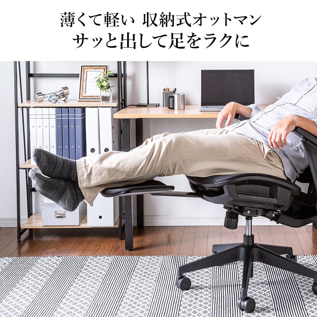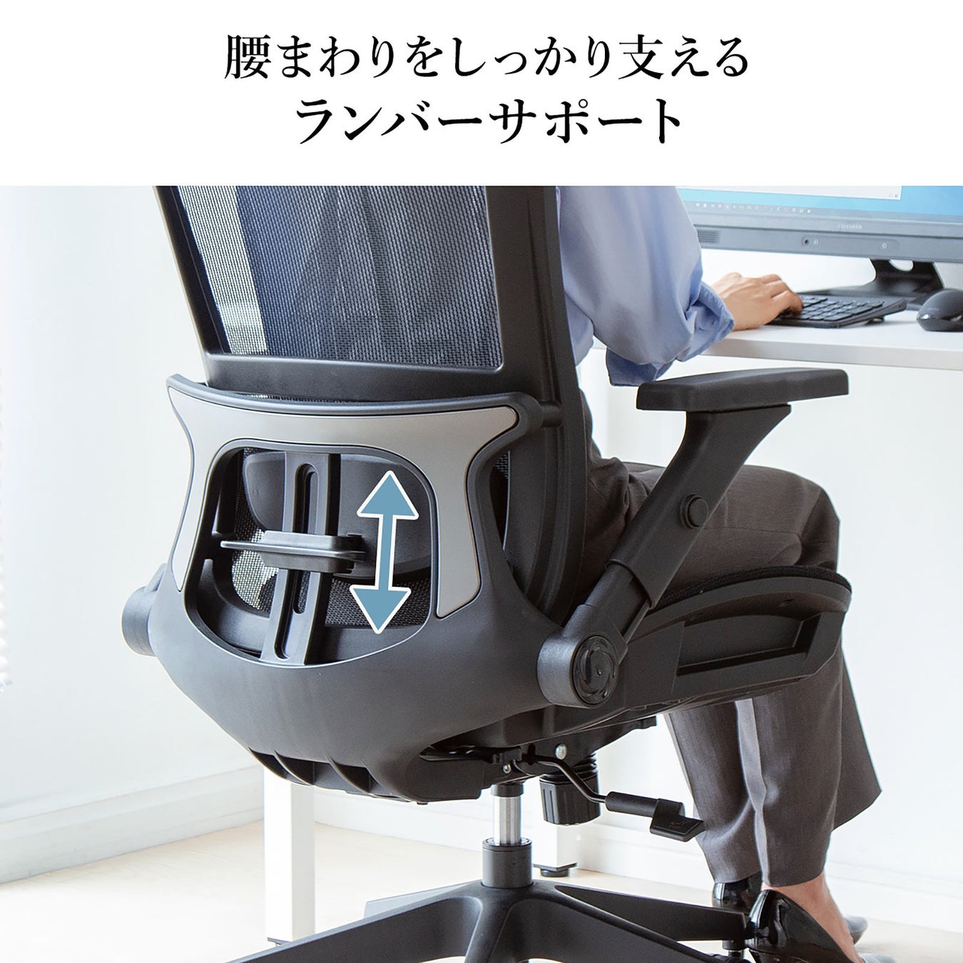 メッシュチェア シンクロロッキング ロッキング固定 跳ね上げアームレスト 薄型オットマン付き 4D ランバーサポート